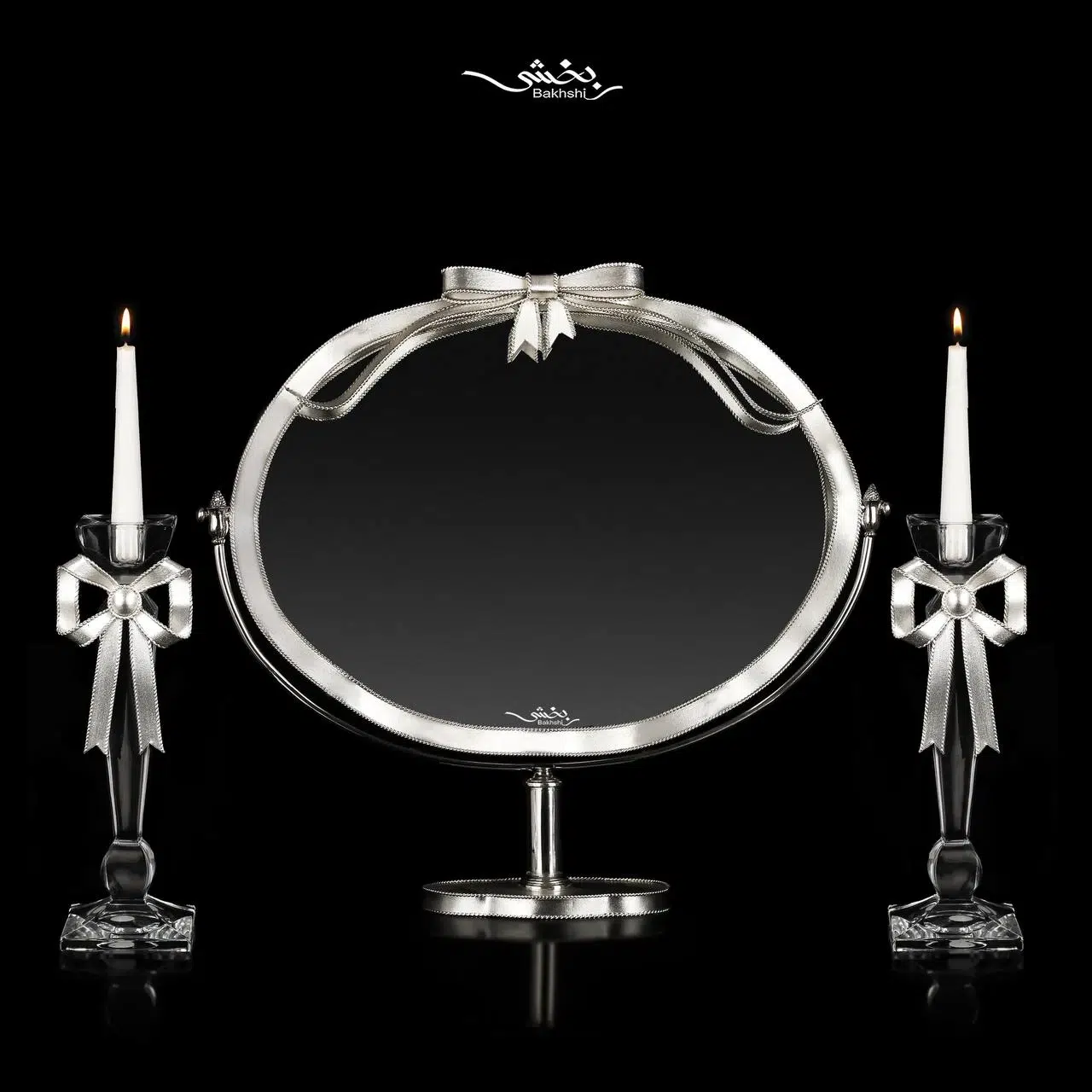 آینه نقره بیضی پاپیون (t003447) وزن:779 گرم طول ۴۵سانتیمتر ارتفاع ۴۱/۵ شمعدان نقره پاپیون (t003634) وزن ۱۲۴ ارتفاع ۲۵