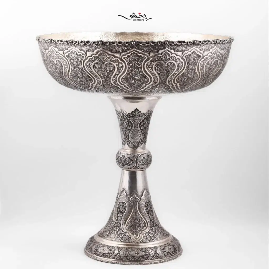 کاسه نقره پایه دار ریزقلم گل و مرغ اعلا ساخته شده از 1856 گرم نقره با عیار 90 درصد و قطر 30 و ارتفاع 28 سانتیمتر موجود در شعب حضوری و سایت نقره بخشی.