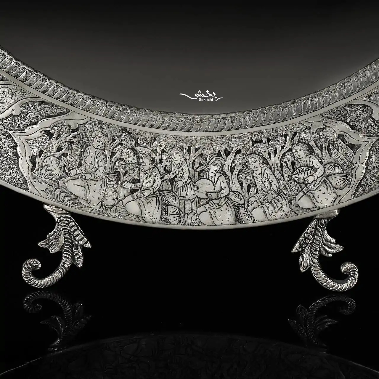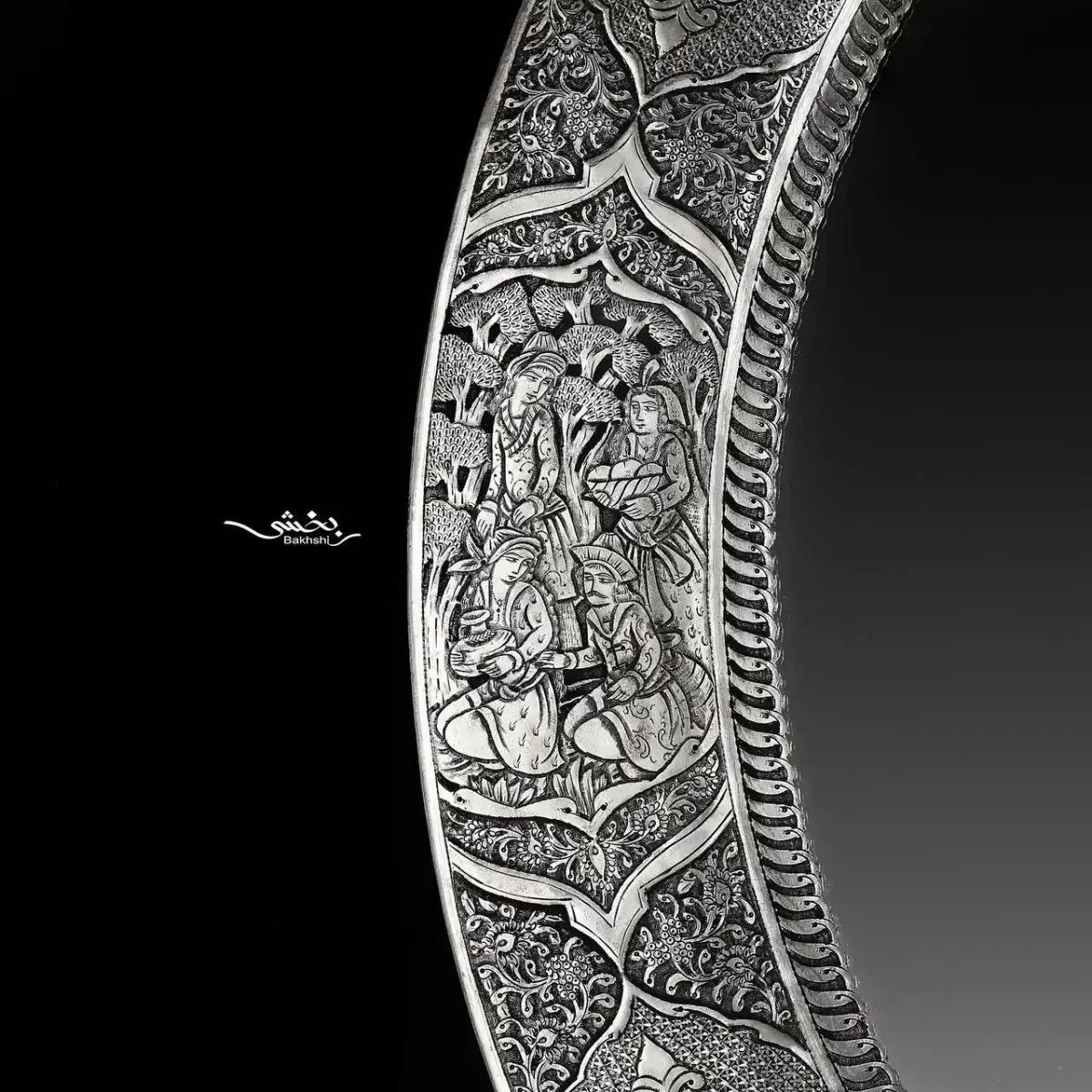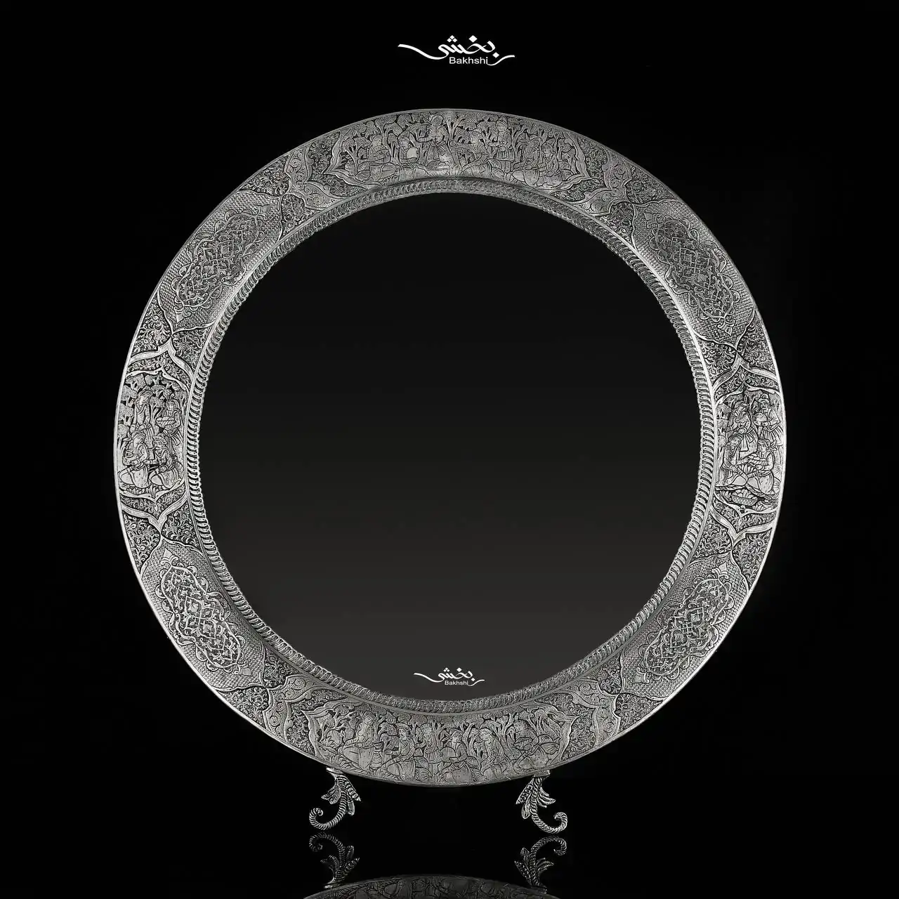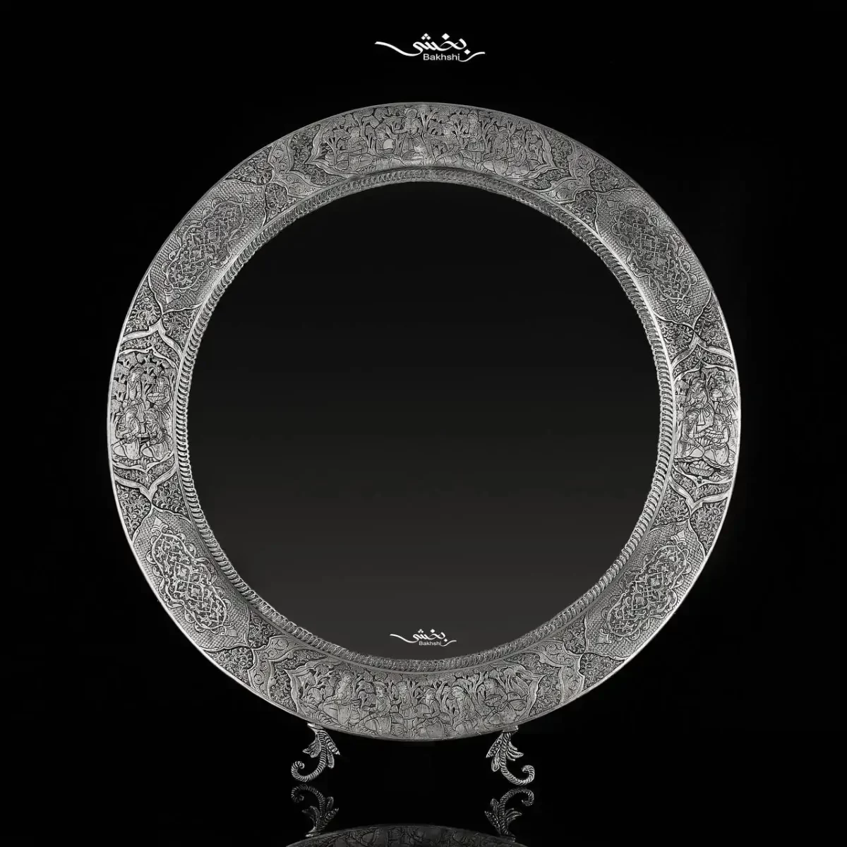 آینه گرد نقره مینیاتور ریزقلم با وزن 1378 گرم نقره با عیار 90 درصد و قطر 58 و ارتفاع با پایه 62.5 سانتیمتر موجود در شعب حضوری و سایت نقره بخشی.