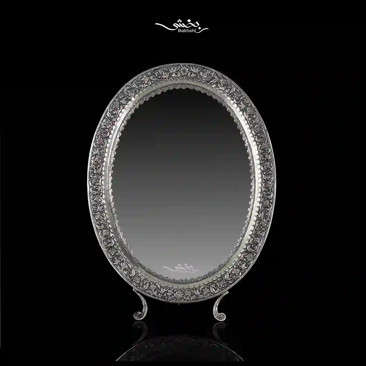 آینه بیضی متوسط نقره قلم گل و مرغ (کد T004643)