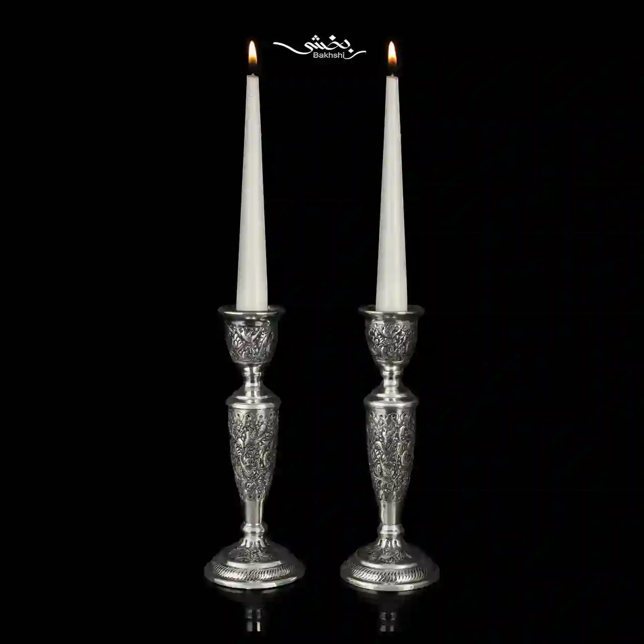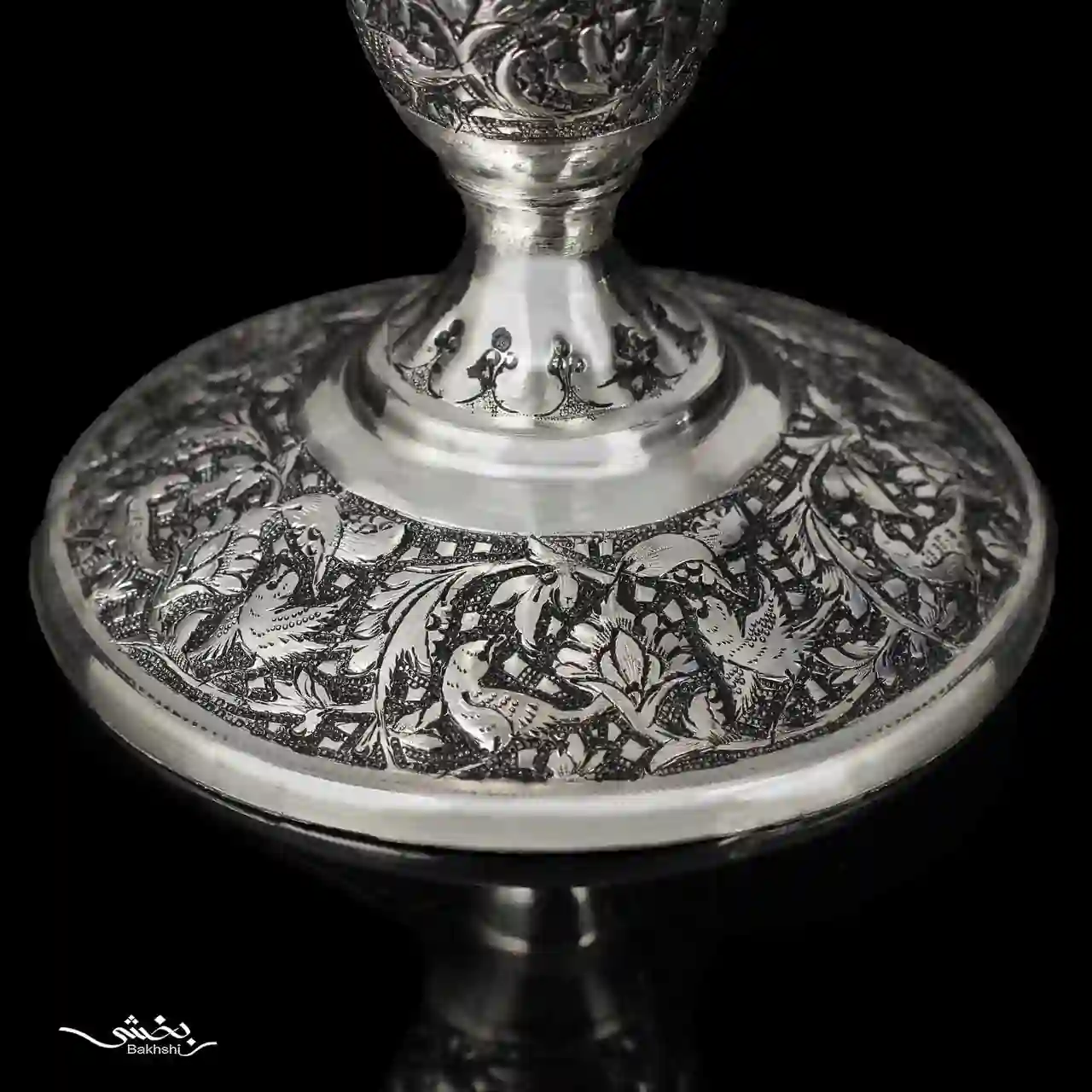 شمعدان تکشاخه پایهبلند نقره قلم گل و مرغ – مدل ۲ (کد T004646)