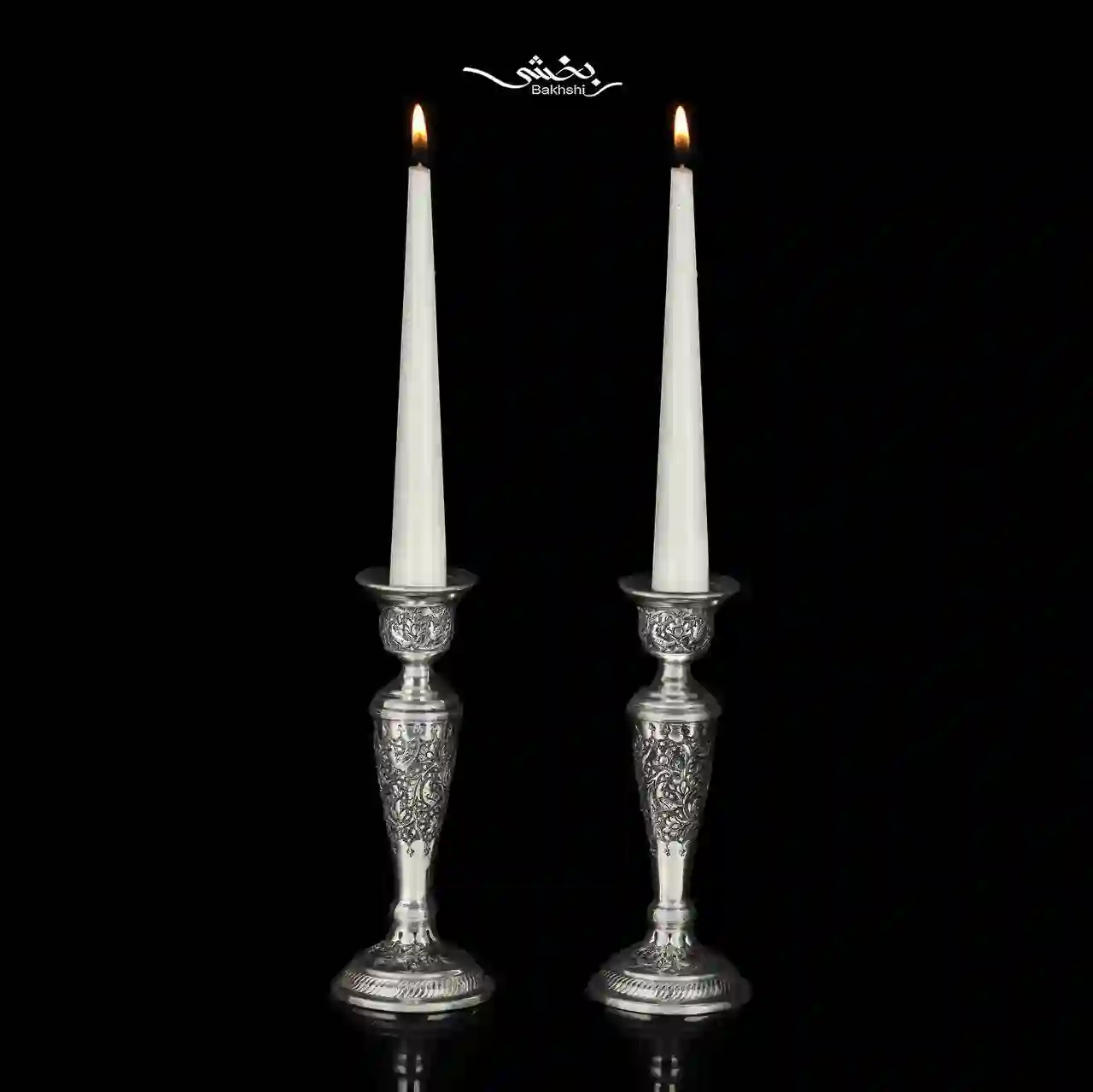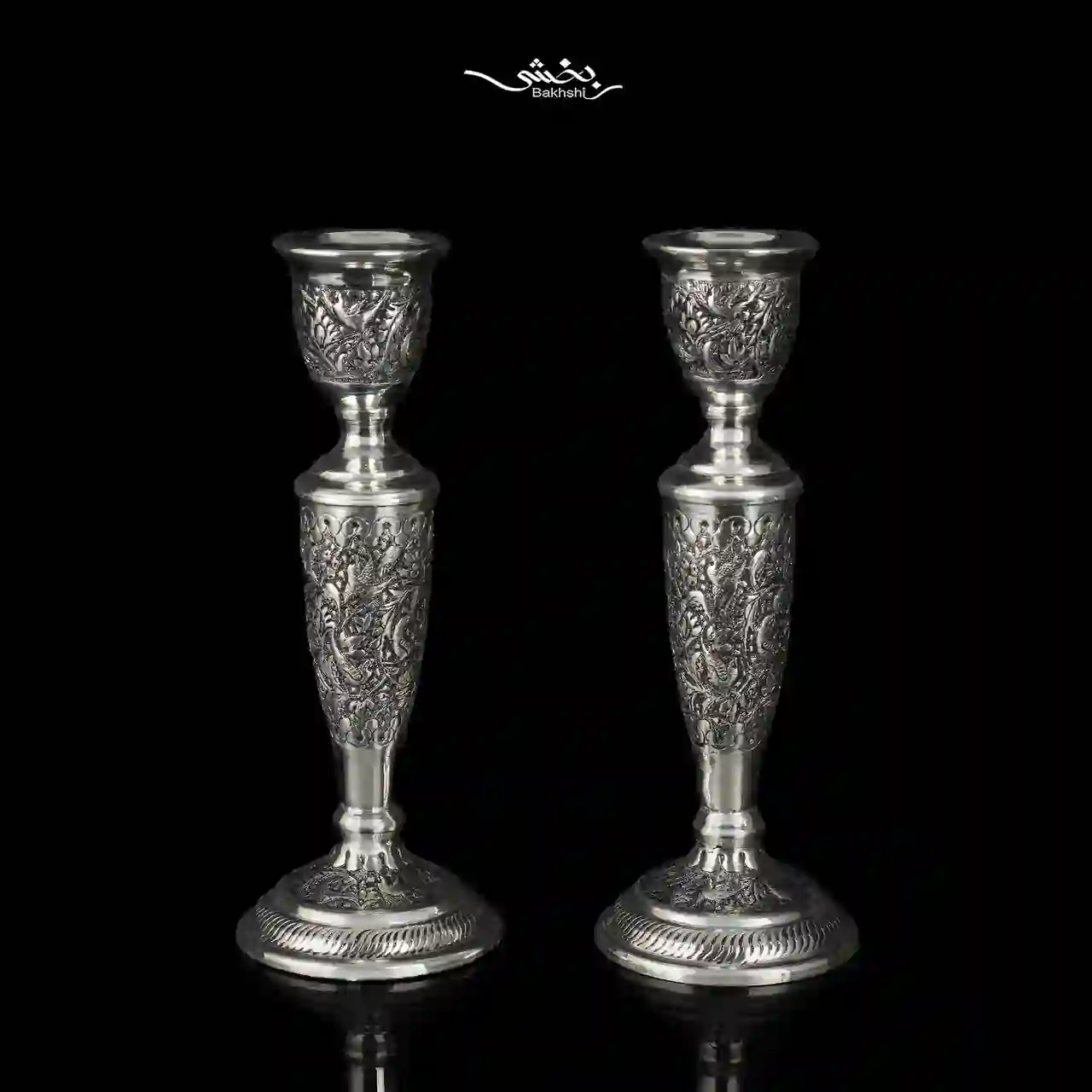 ست آینه بیضی متوسط و شمعدانهای تکشاخه قلم گل و مرغ از مجموعه محصولات اصیل نقره بخشی است. در این ست، آینه پایهدار بیضی در کنار دو مدل شمعدان پایهبلند قرار گرفته و هماهنگی طرح قلم گل و مرغ موجب ایجاد جلوهای یکدست و چشمنواز در چیدمان شده است. این ترکیب برای استفاده روی میز کنسول، ویترین، دکور پذیرایی و همچنین چیدمانهای مناسبتی بسیار مناسب میباشد.