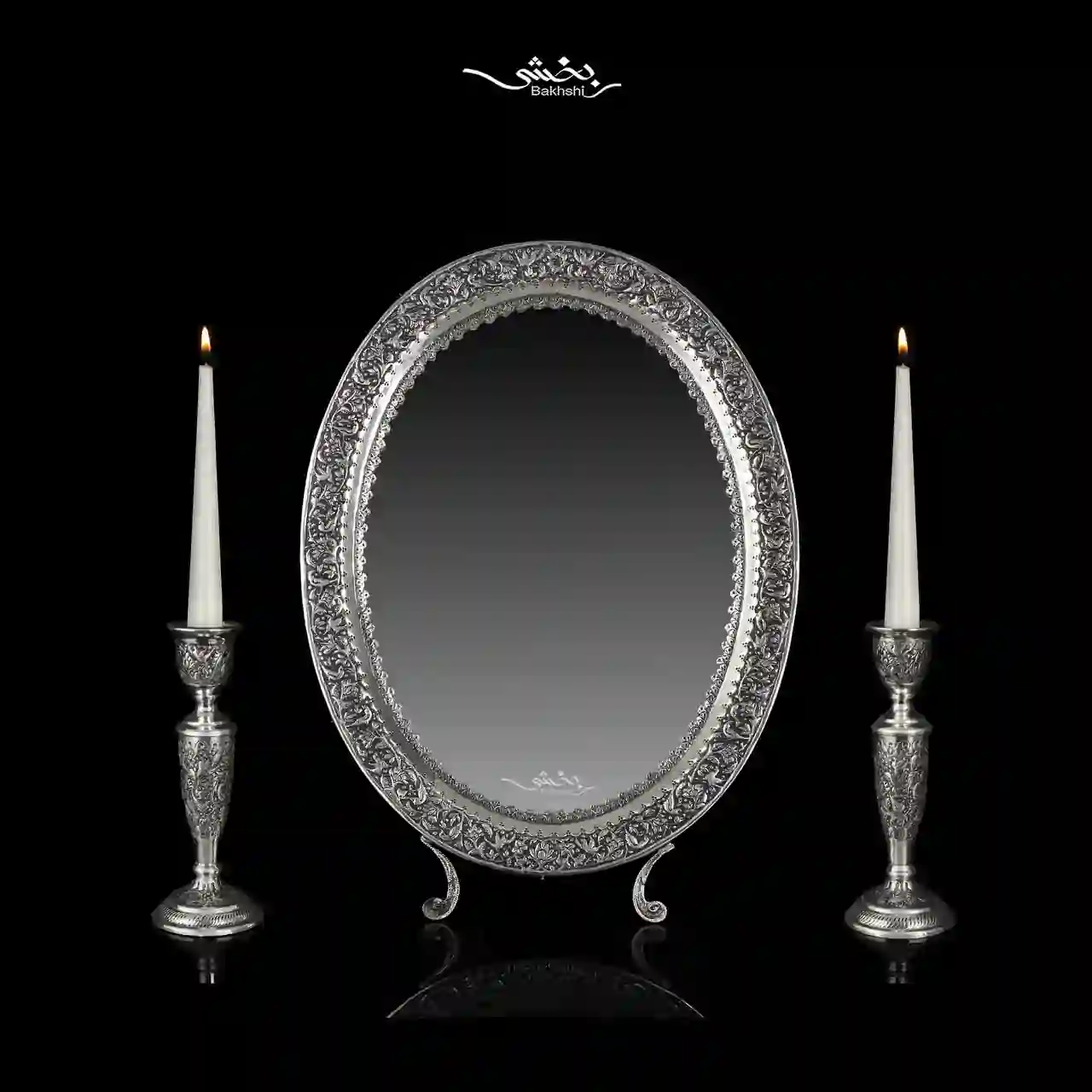 ست آینه بیضی متوسط و شمعدان نقره گل و مرغ