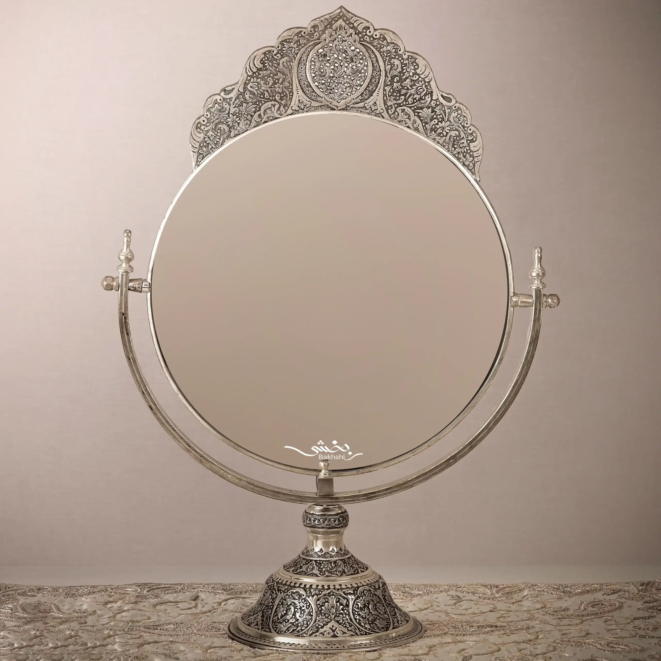 ست آینه نقره گهواره ای تاجدار و شمعدان لاله گل و مرغ