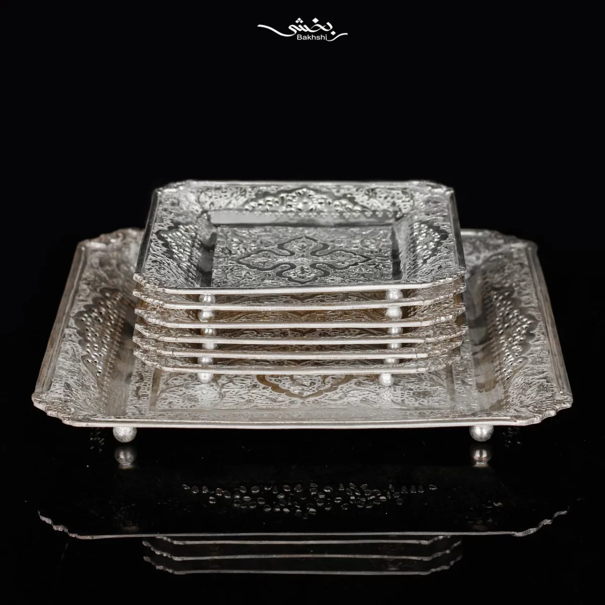 بشقاب بزرگ مربعی نقره قلم گل و مرغ