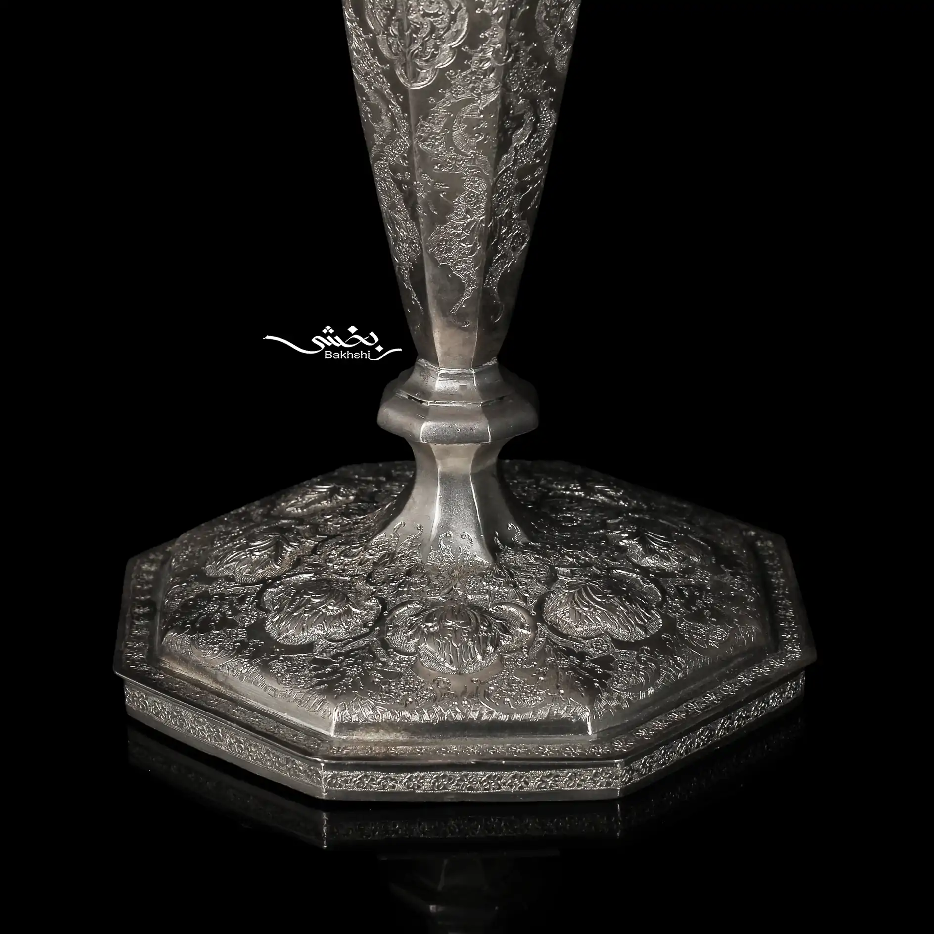 شمعدان نقره سه شاخه گل و مرغ ساخته شده از 2215 گرم نقره با عیار 84 و ارتفاع 44.5 و عرض 30 سانتیمتر موجود در شعب حضوری و سایت نقره بخشی.