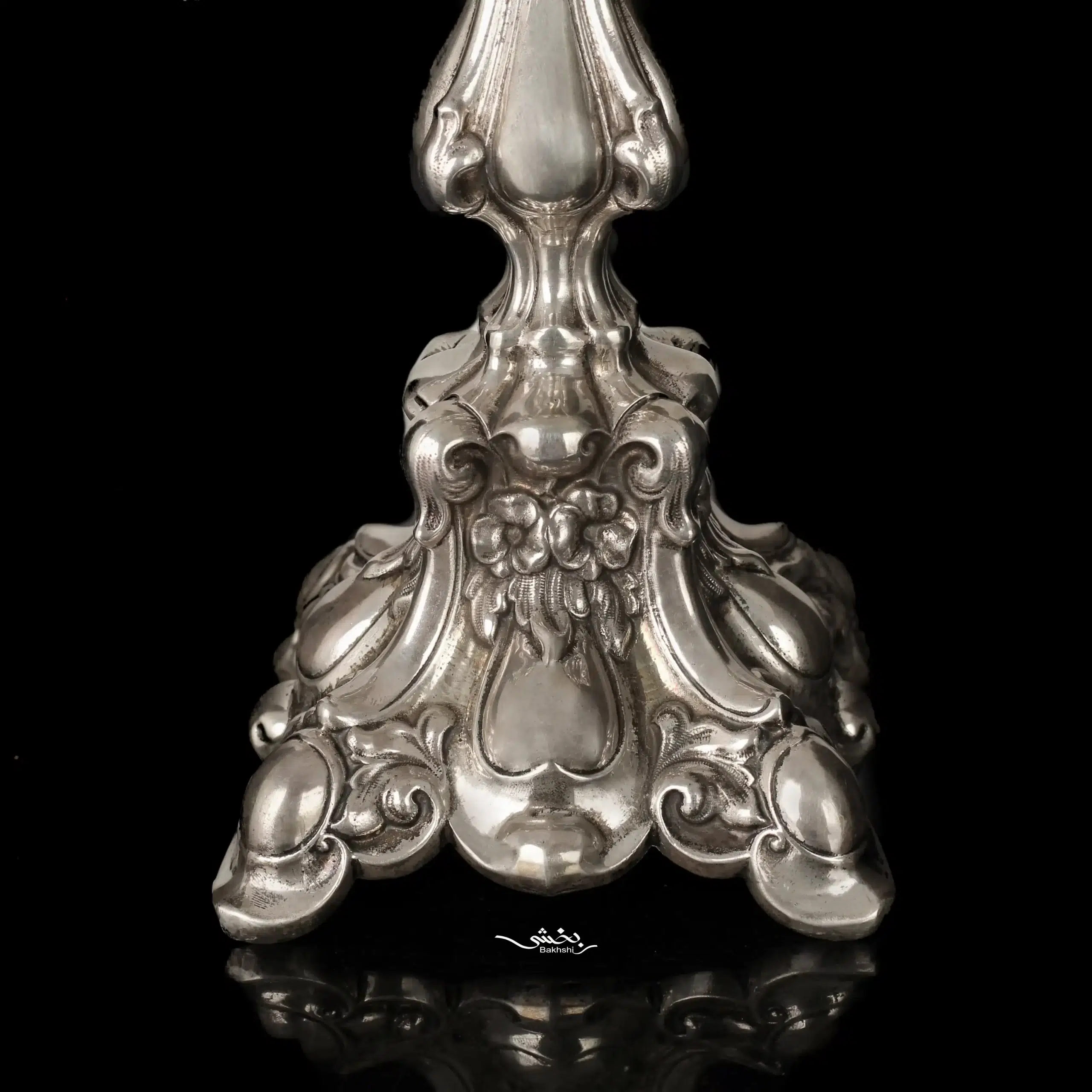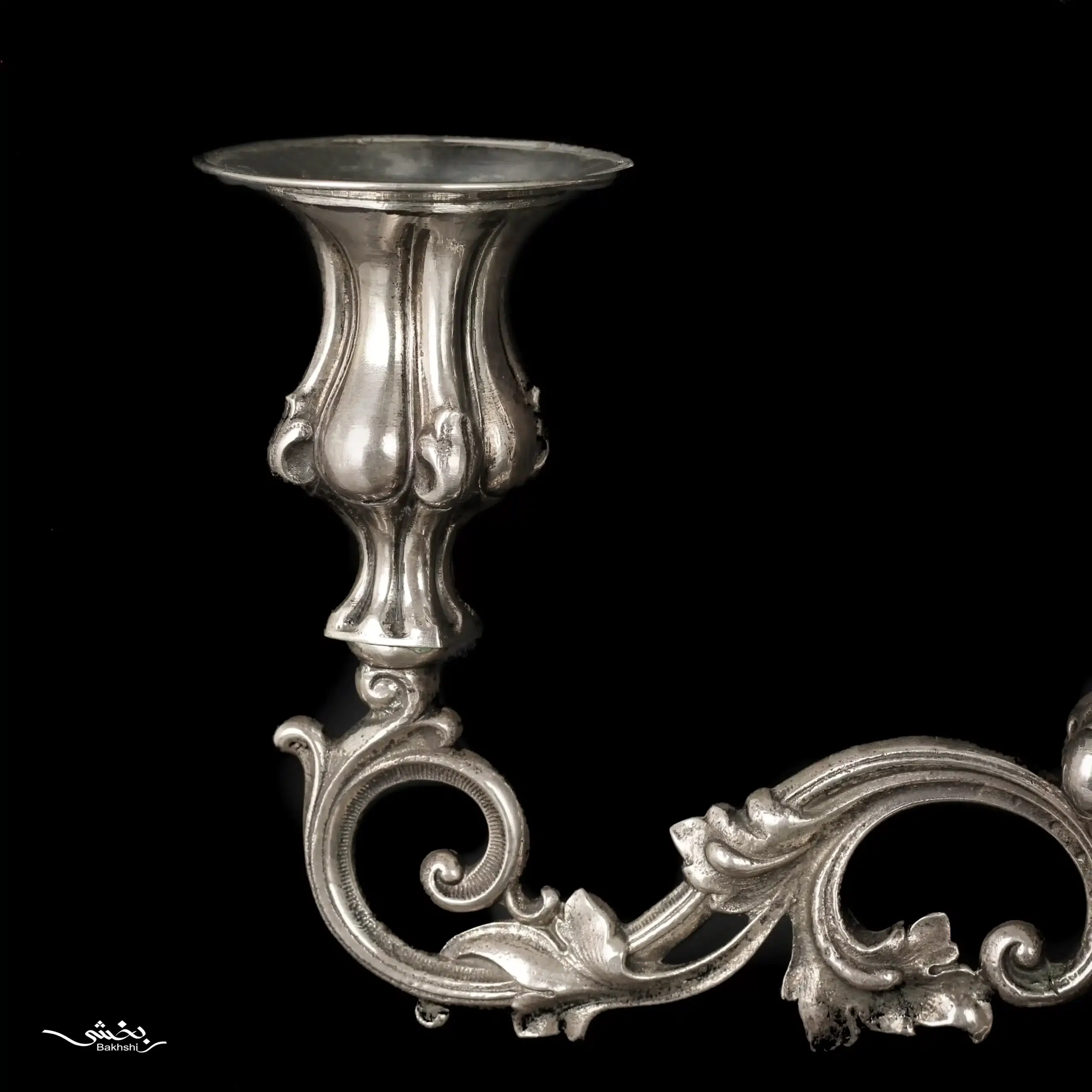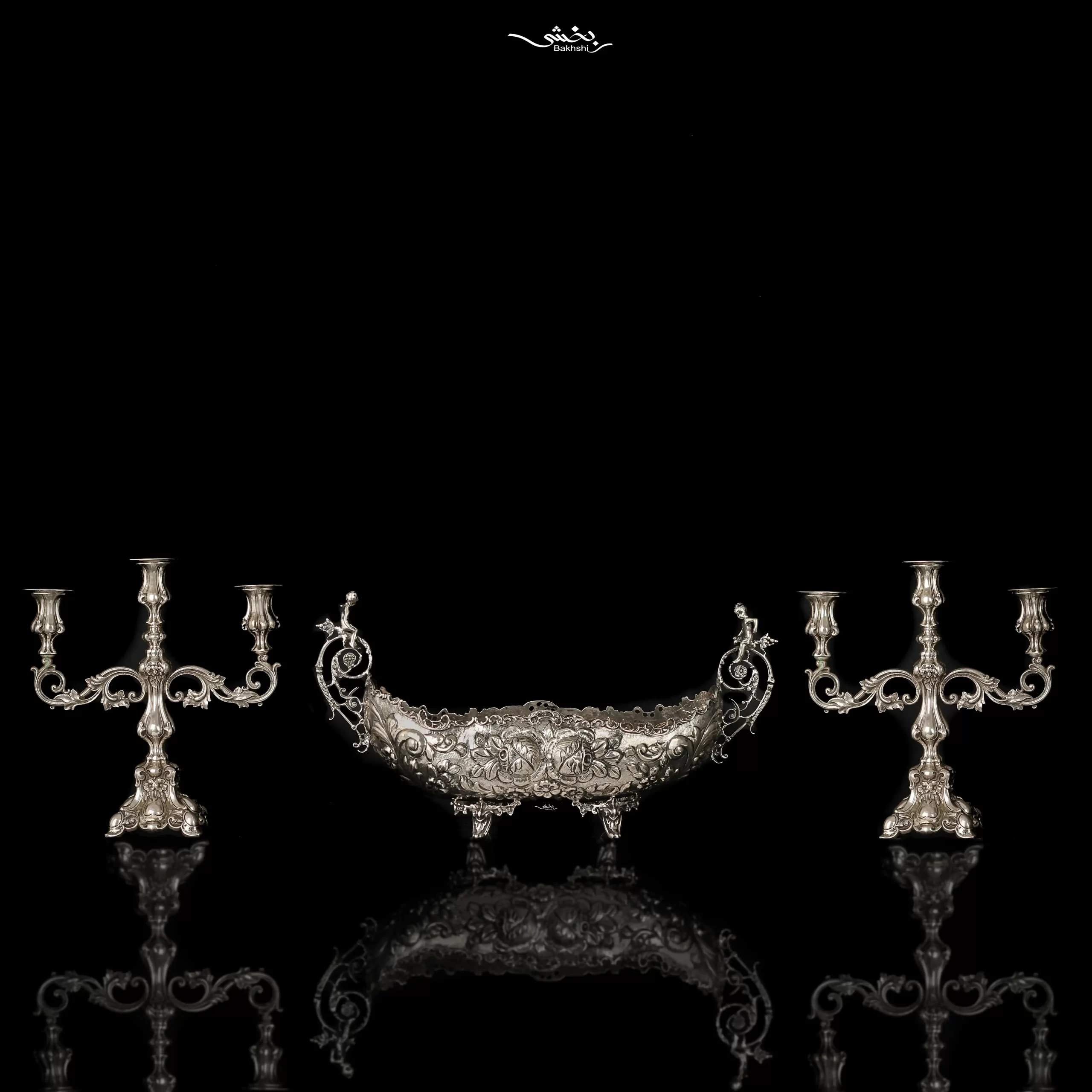 شمعدان نقره مدرن سه شاخه ساخته شده از 2590.4 گرم نقره با عیار 90 درصد و ارتفاع 33.5 و عرض 29.5 سانتیمتر موجود در شعب حضوری و سایت نقره بخشی.