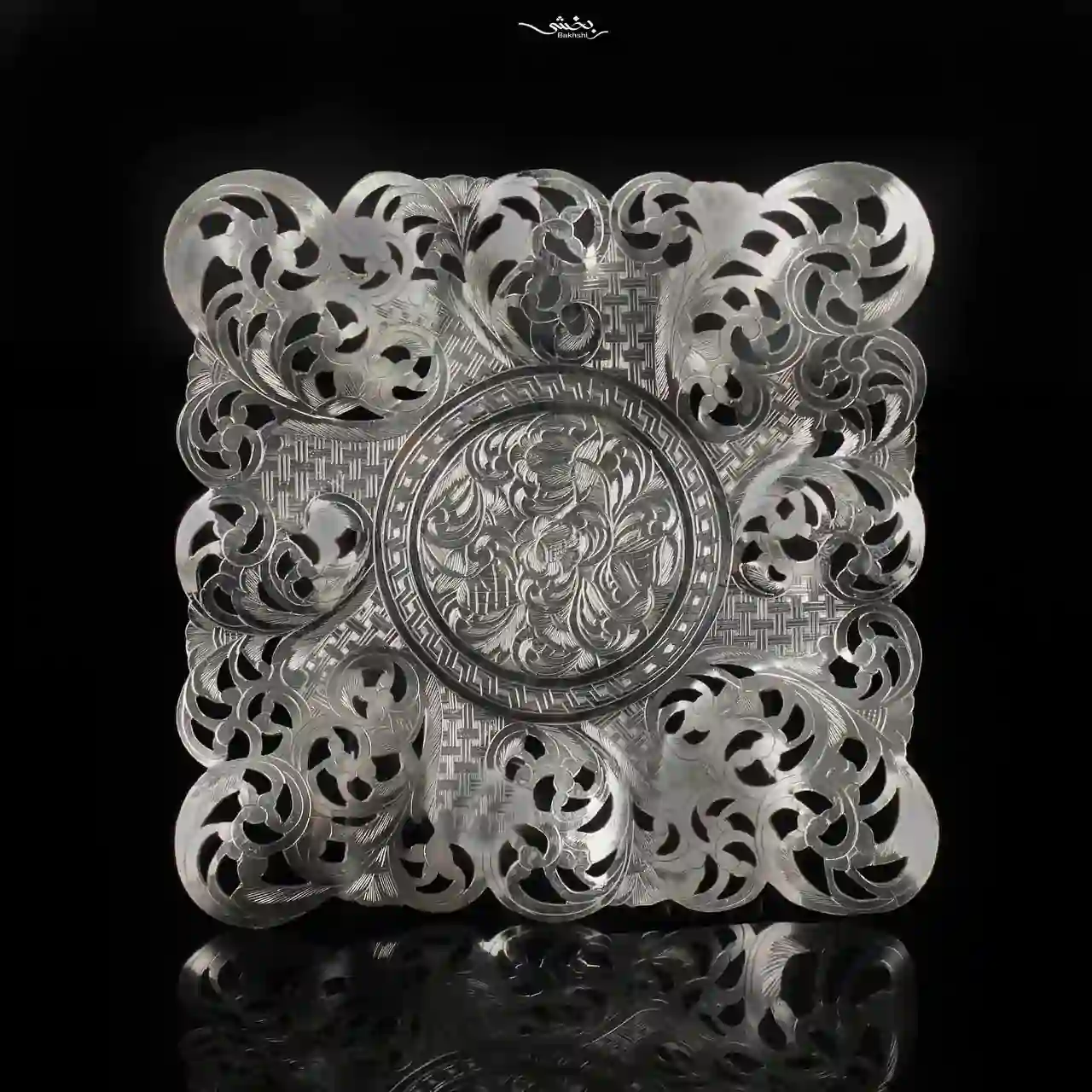 شیرینیخوری نقره مربع پایهدار قلمزنی تبریز – نقره بخشی