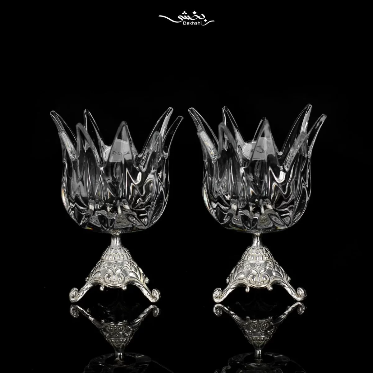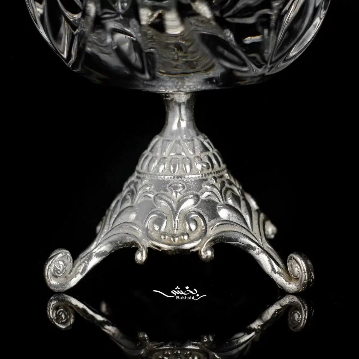 شمعدان تکی کریستال و نقره سه پایه در 4 وزن مختلف ساخته شده از نقره با عیار 92.5 درصد و کریستال زیبای نقره موجود در شعب حضوری و سایت نقره بخشی.
