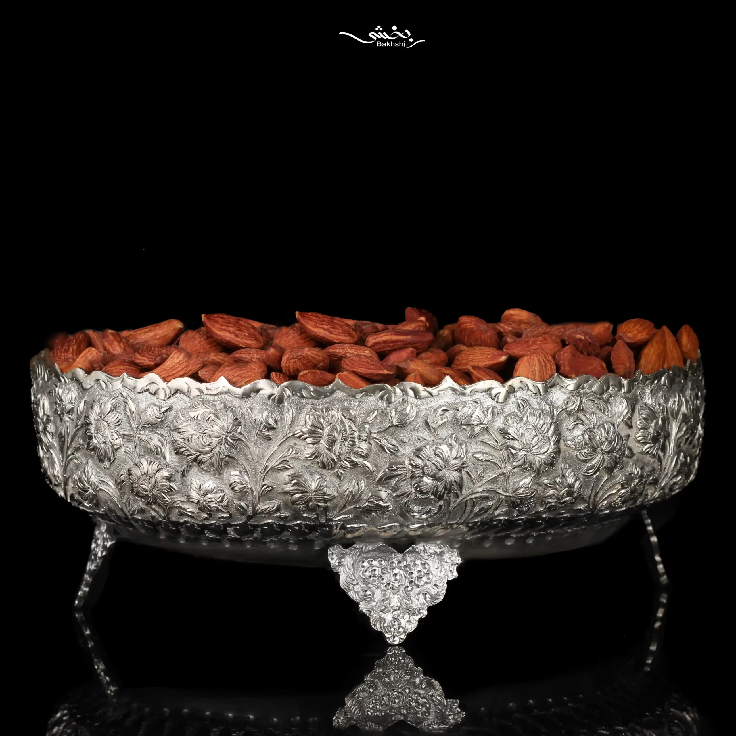 آجیل خوری نقره بیضی گل برجسته ساخته شده از 703 گرم نقره با عیار 84 درصد و ابعاد 24.5 در 20 و ارتفاع 9 سانتیمتر موجود در شعب نقره بخشی.