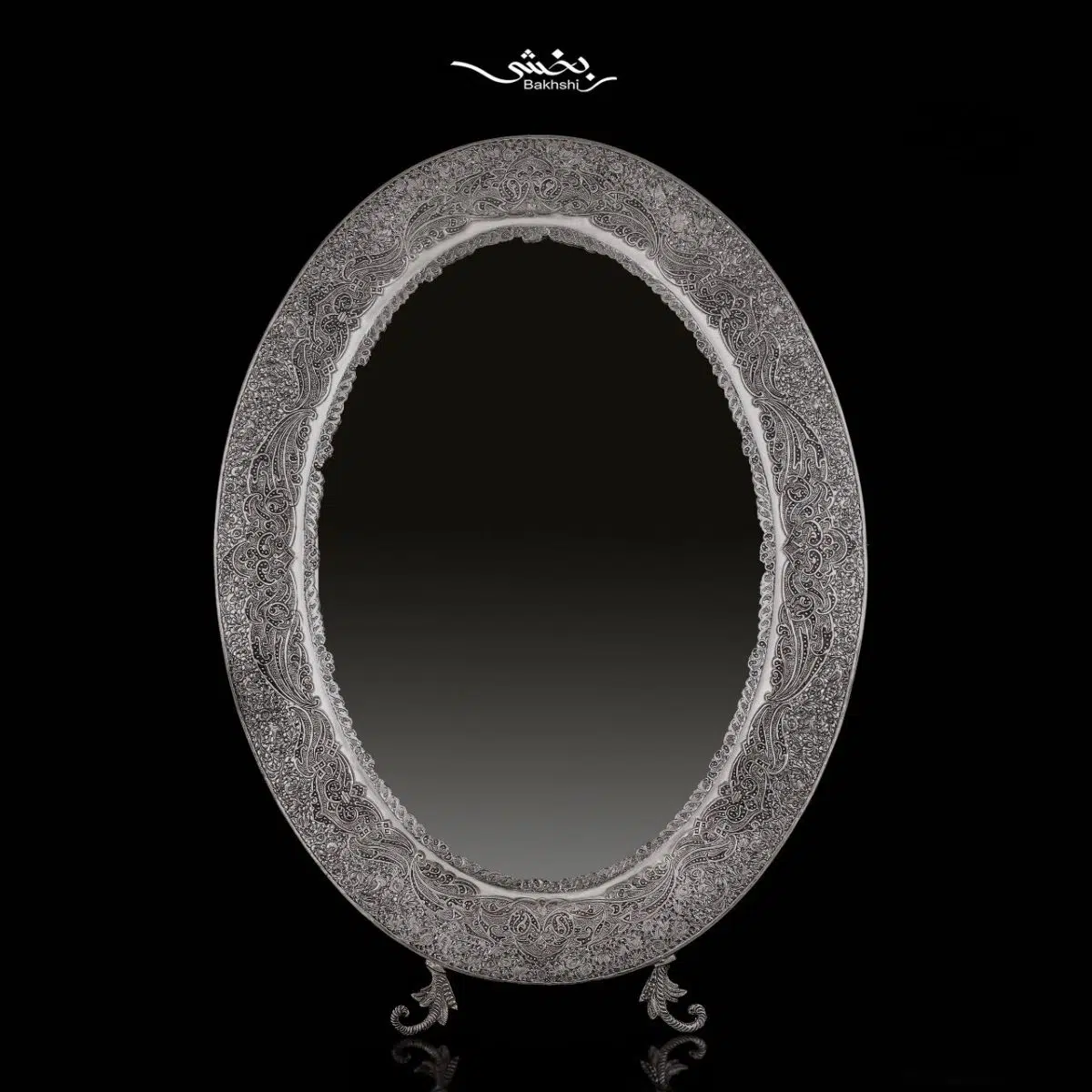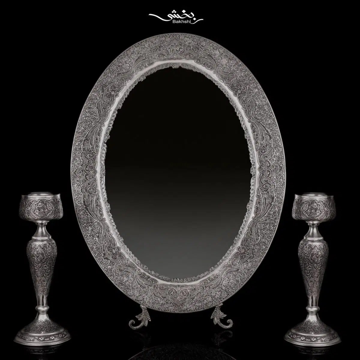 این ست شامل آینه نقره بیضی گل و مرغ مشبک اعلا با وزن ۱۱۱۵.۲ گرم و شمعدان سهشاخه گل و مرغ ریزقلم با وزن ۲۳۵۹.۳ گرم است. آینه دارای ابعاد ۶۰×۴۵ و ارتفاع ۶۳ سانتیمتر (با پایه) و شمعدانها دارای ارتفاع ۳۹ سانتیمتر هستند. مناسب برای دکوراسیون، سفره عقد و چیدمانهای تشریفاتی، و هماکنون در فروشگاه و سایت نقره بخشی موجود است.مشخصات آینه نقره بیضی گل و مرغ مشبک: