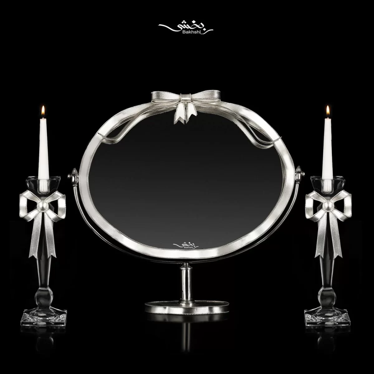 ست آینه و شمعدان بیضی نقره پاپیون