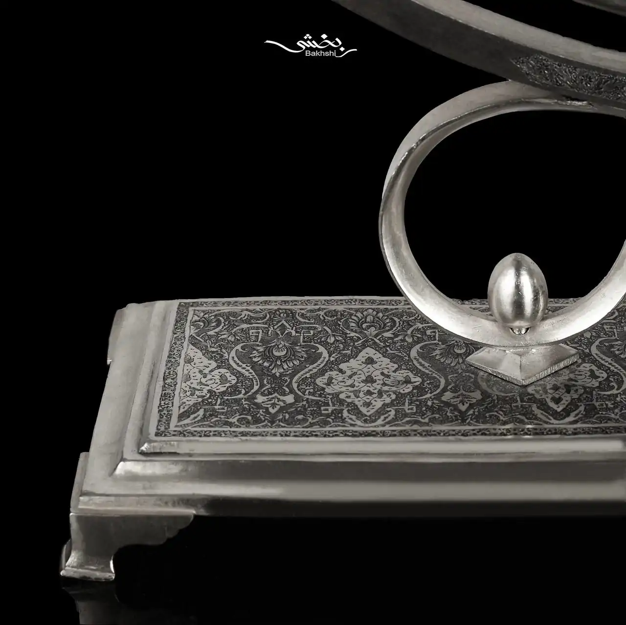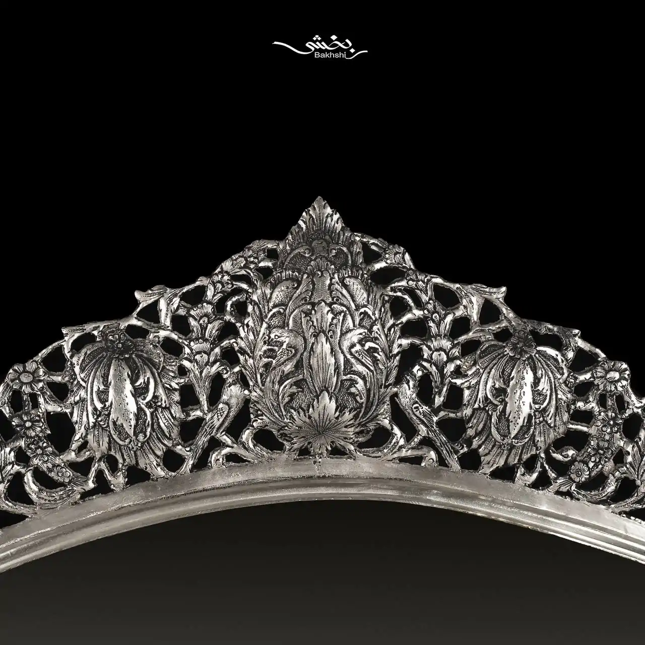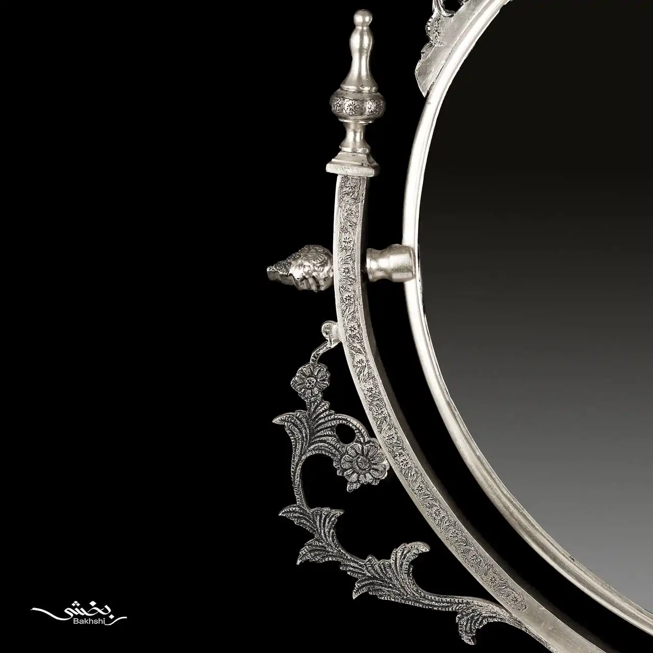 آینه نقره گهواره ای ترنج ریزقلم ساخته شده از 2092 گرم نقره با عیار 84 درصد و ابعاد 56 در 55 سانتیمتر موجود در شعب حضوری و سایت نقره بخشی.