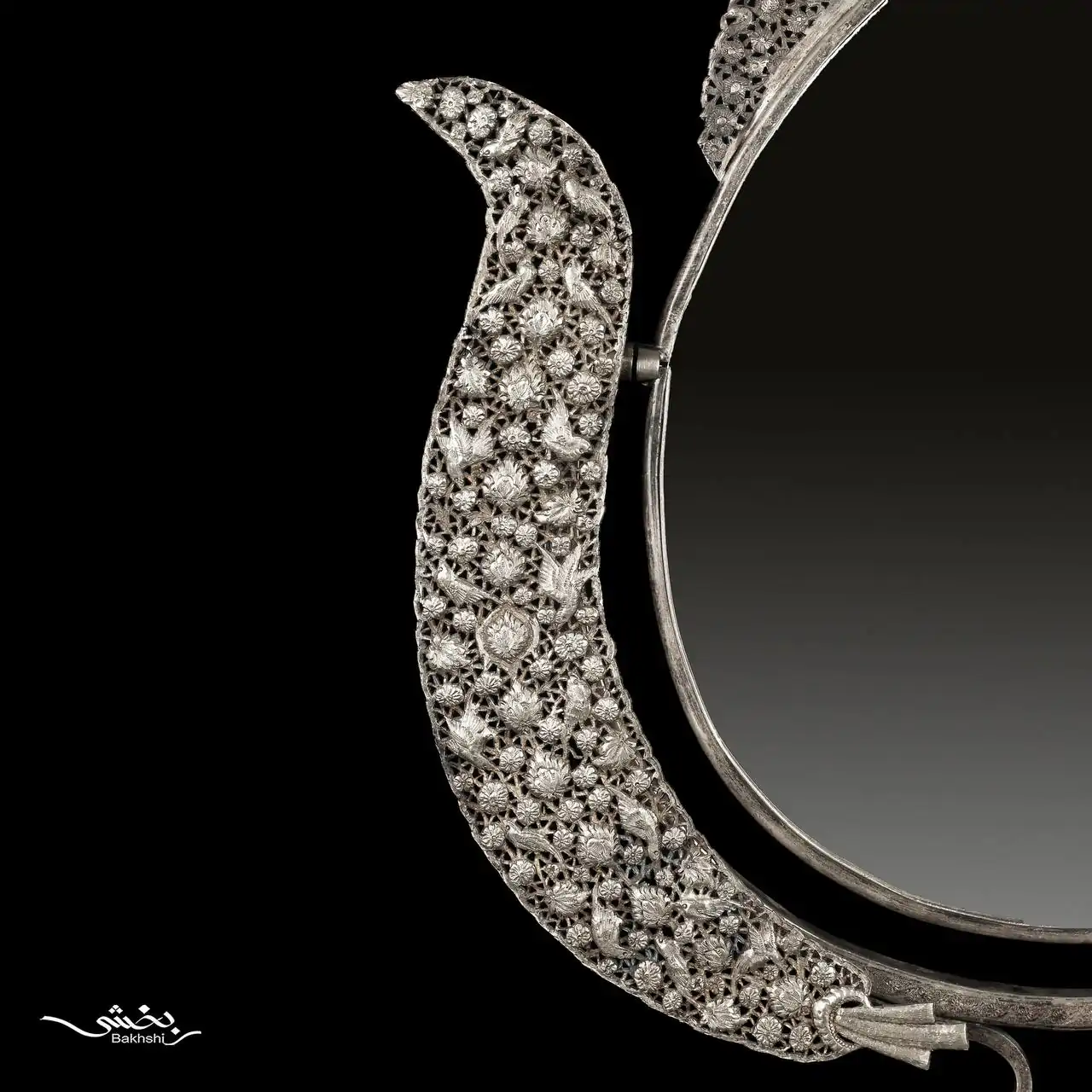 آینه نقره گهواره ای قلم ترنج با ابعاد 53 در 52 سانتیمتر و 1528 گرم نقره با عیار 50 درصد موجود در شعب حضوری و سایت نقره بخشی.