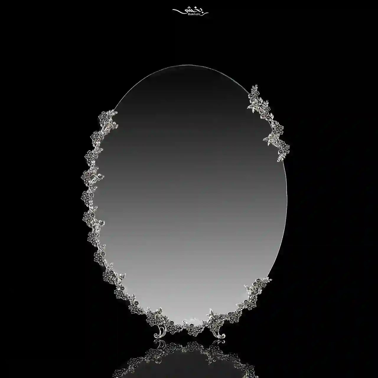 آینه نقره بیضی مدرن تشکیل شده از نقره با عیار 92.5 درصد و ابعاد 38*28 و 49*37 سانتیمتر موجود در شعب حضوری و سایت نقره بخشی.