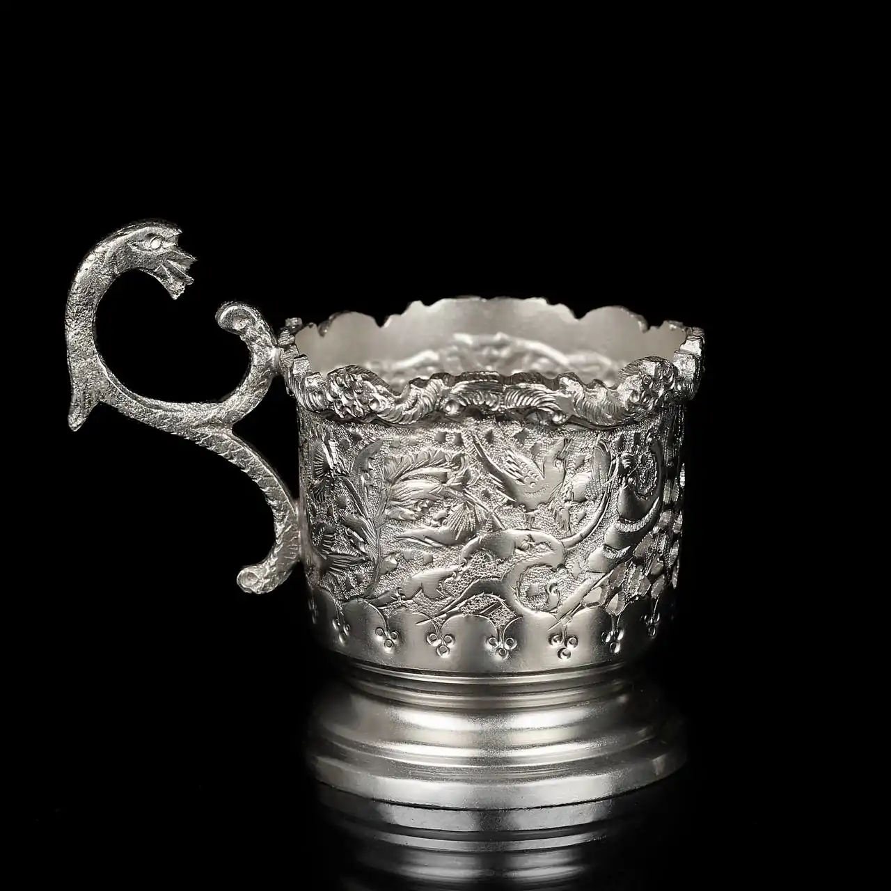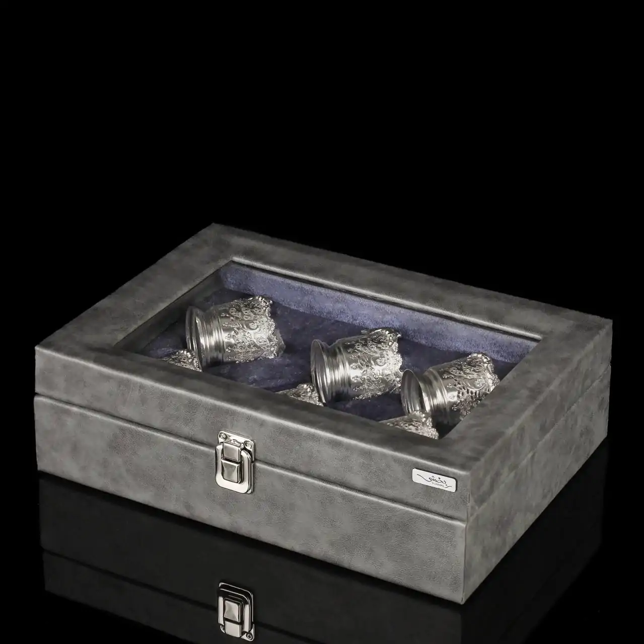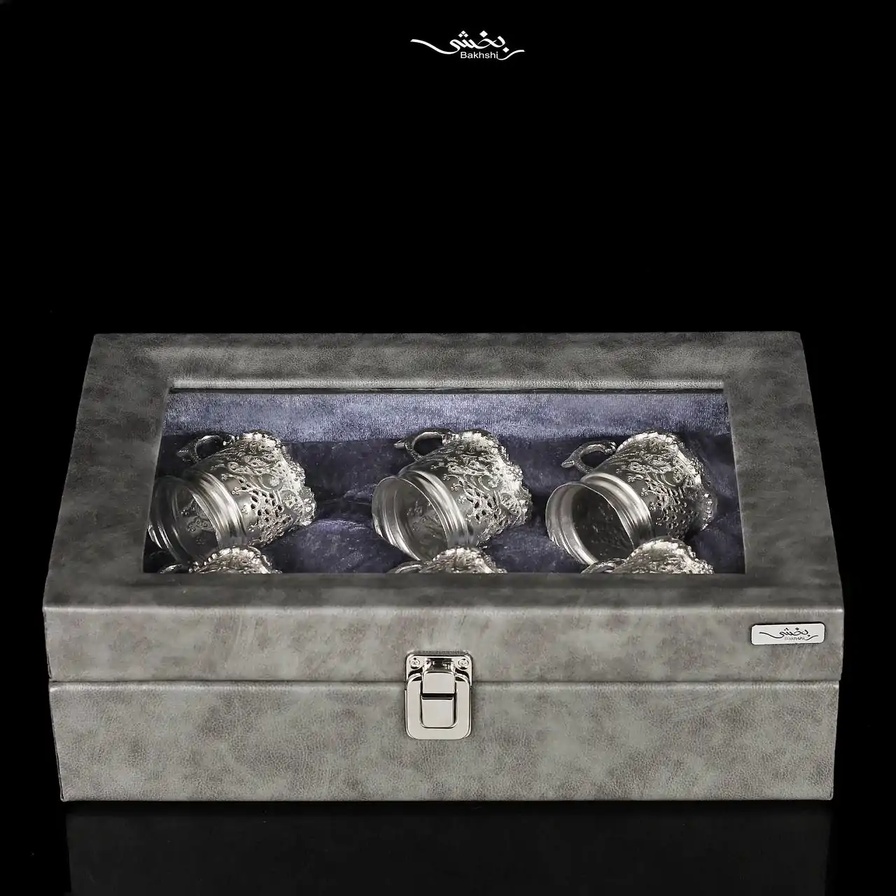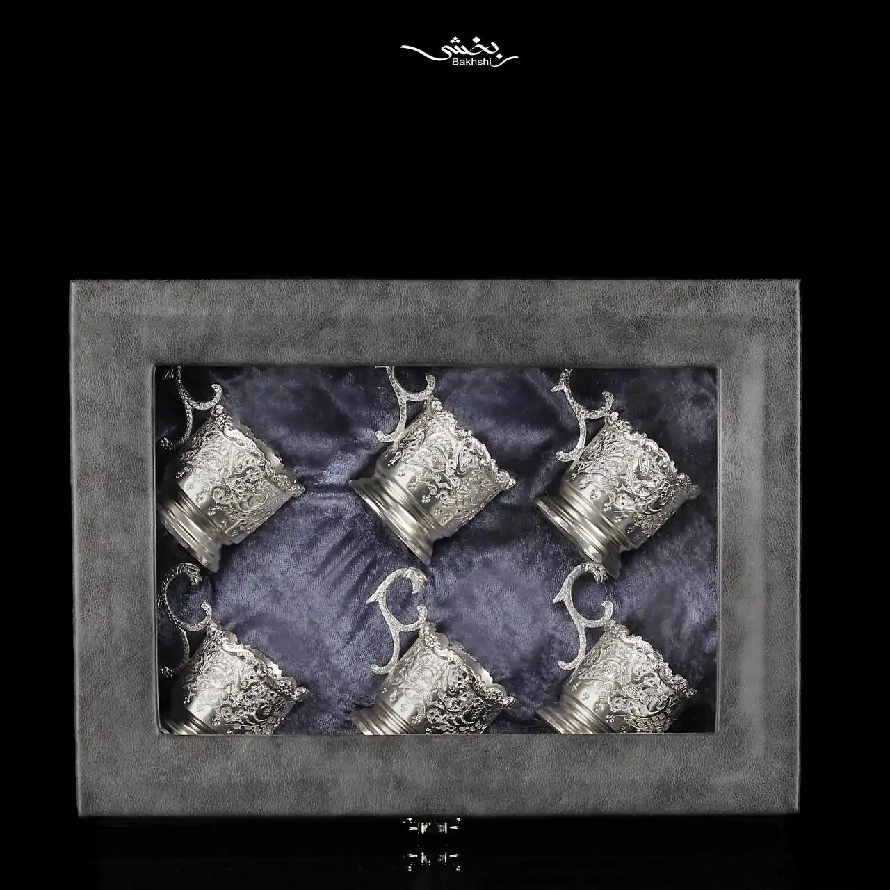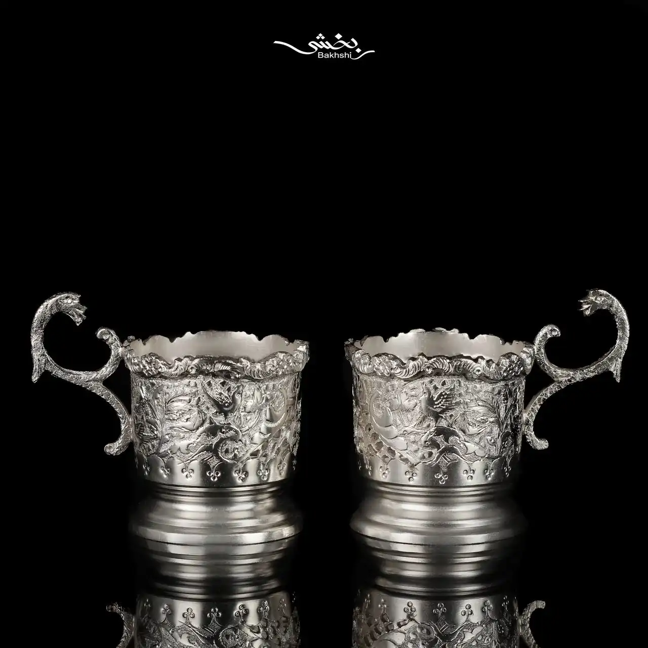 انگاره نقره شش عددی قلم گل و مرغ ساخته شده از 535 گرم نقره با خلوص 84 درصد و قطر 5 سانتیمتر و ارتفاع 6 سانیمتر موجود در شعب حضوری و سایت نقره بخشی.