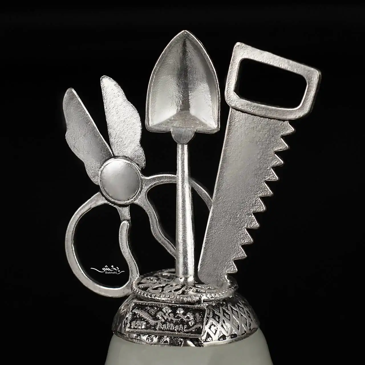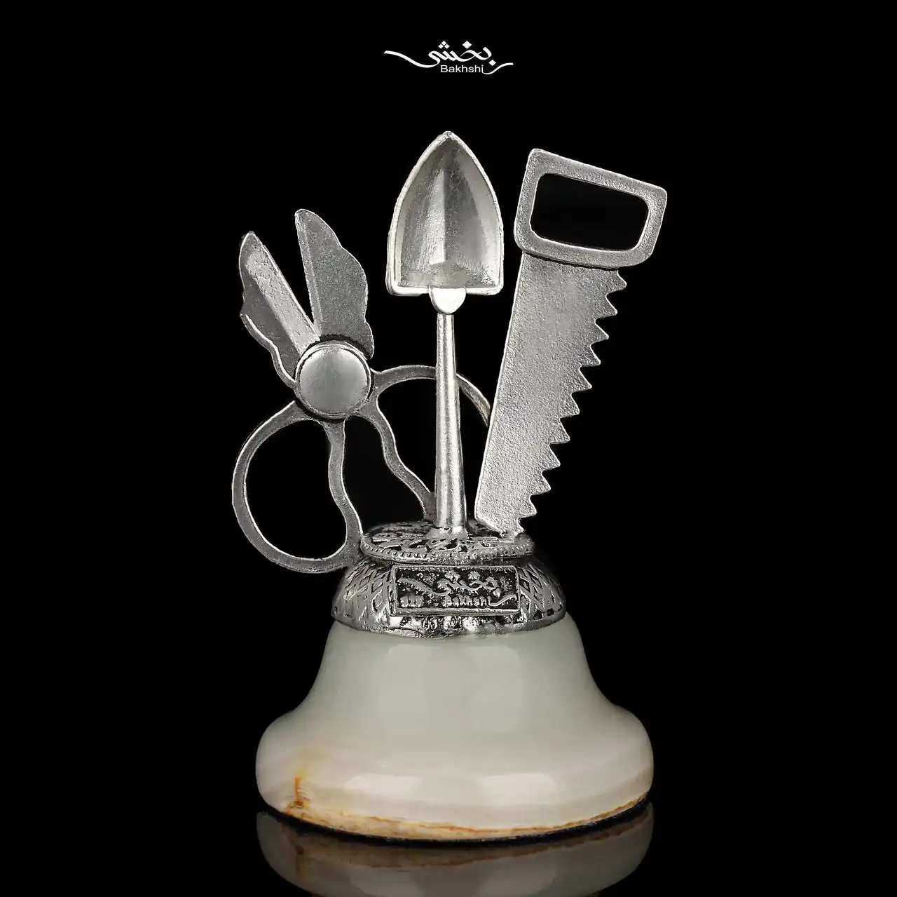 تندیس نقره ابزار باغبانی مدرن با ارتفاع 9 و قطر پایه سنگ 5 سانتیمتر و ساخته شده از 42 گرم نقره با عیار 925 موجود در شعب حضوری و سایت نقره بخشی.