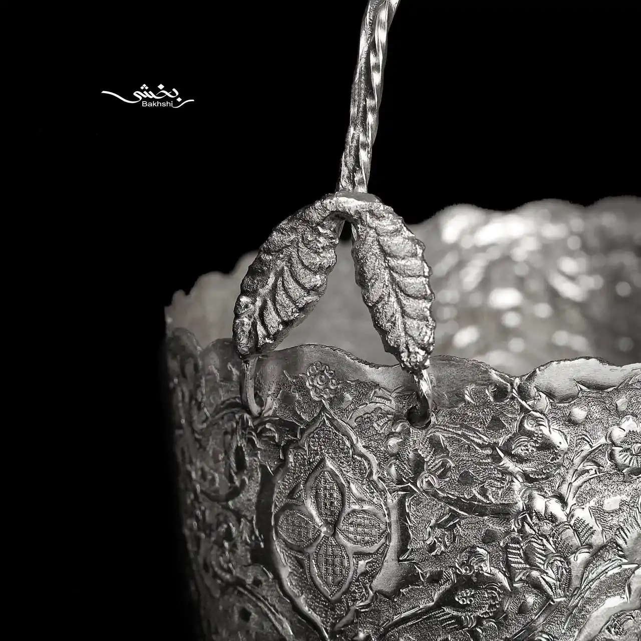 سبد نقره دسته دار بیضی قلم گل و مرغ ساخته شده از 318.1 گرم نقره با عیار 84 درصد و ابعاد 15 در 11 سانتیمتر و ارتفاع 18 سانتیمتر با احتساب دسته در نقره بخشی.