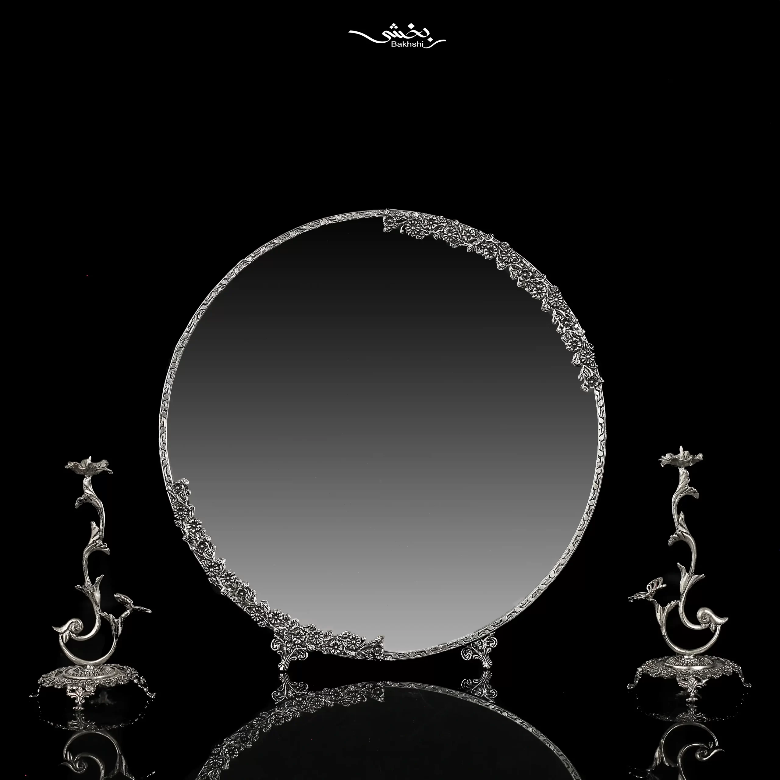 ست آینه شکوفه و شمعدان پروانه نقره مدرن با ارتفاع شمعدان 15 و قطر آینه 25 سانتیمتر و وزن مجموع 368/7 گرم نقره با عیار 92.5 موجود در شعب حضوری و سایت نقره بخشی.