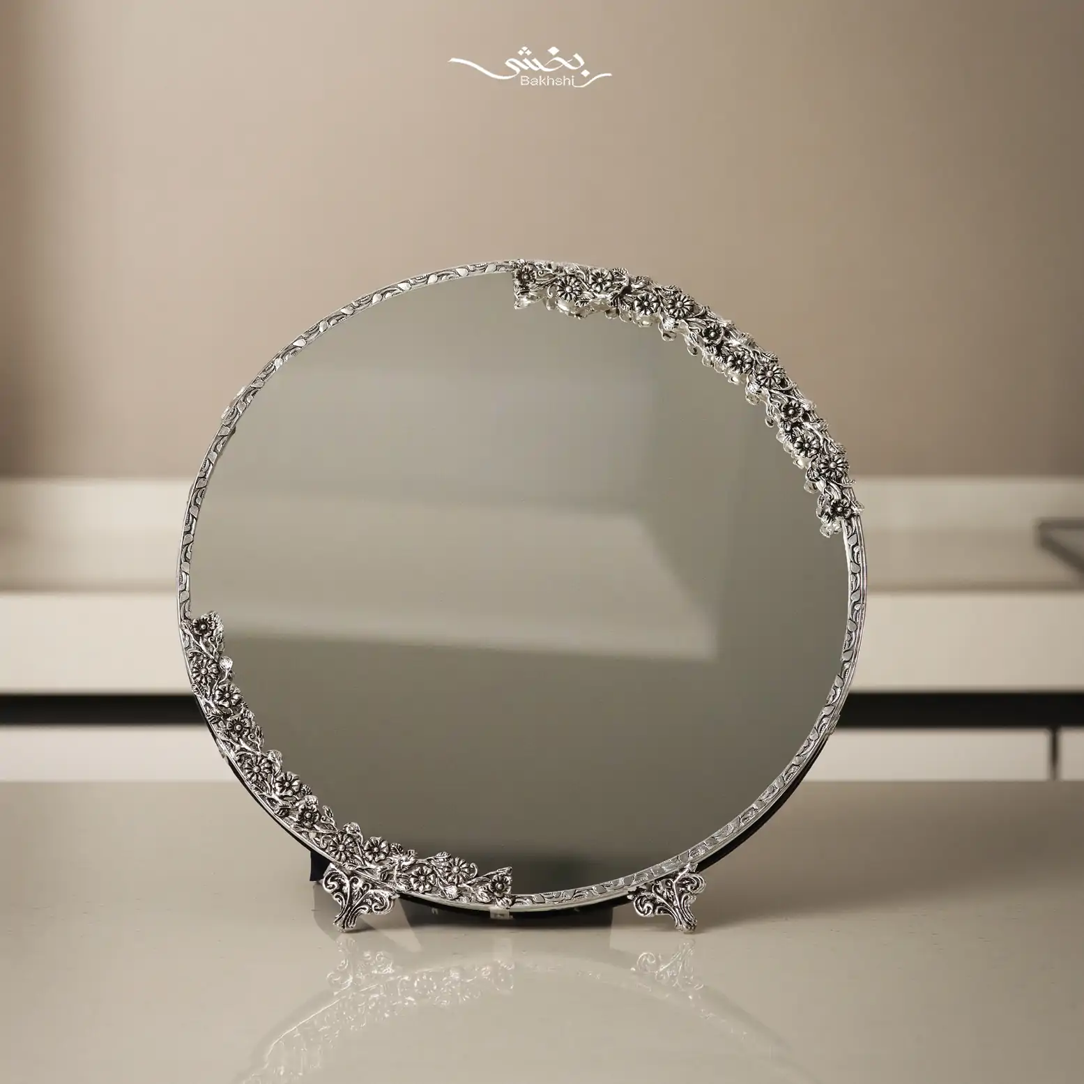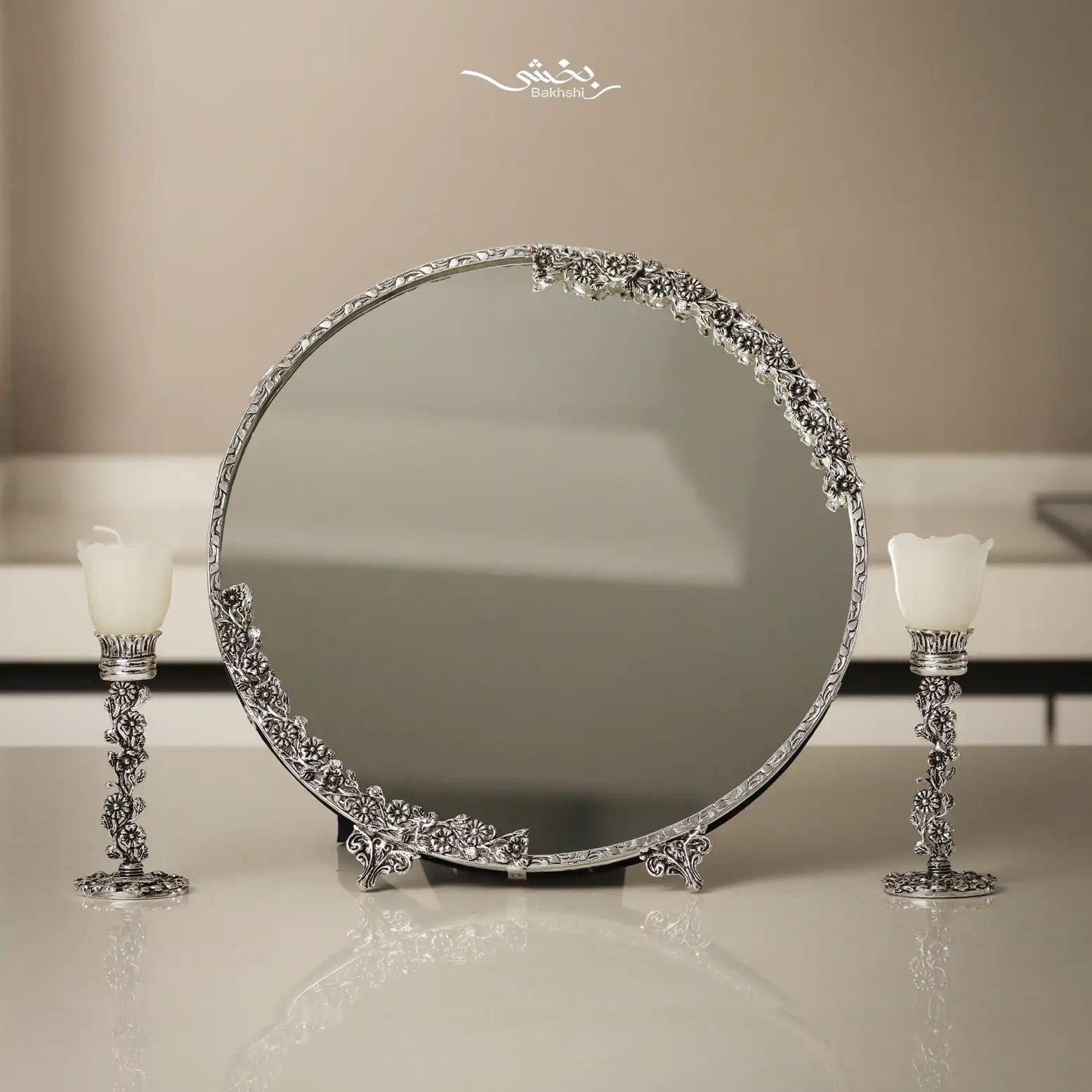 ست آینه گرد و شمعدان نقره شکوفه