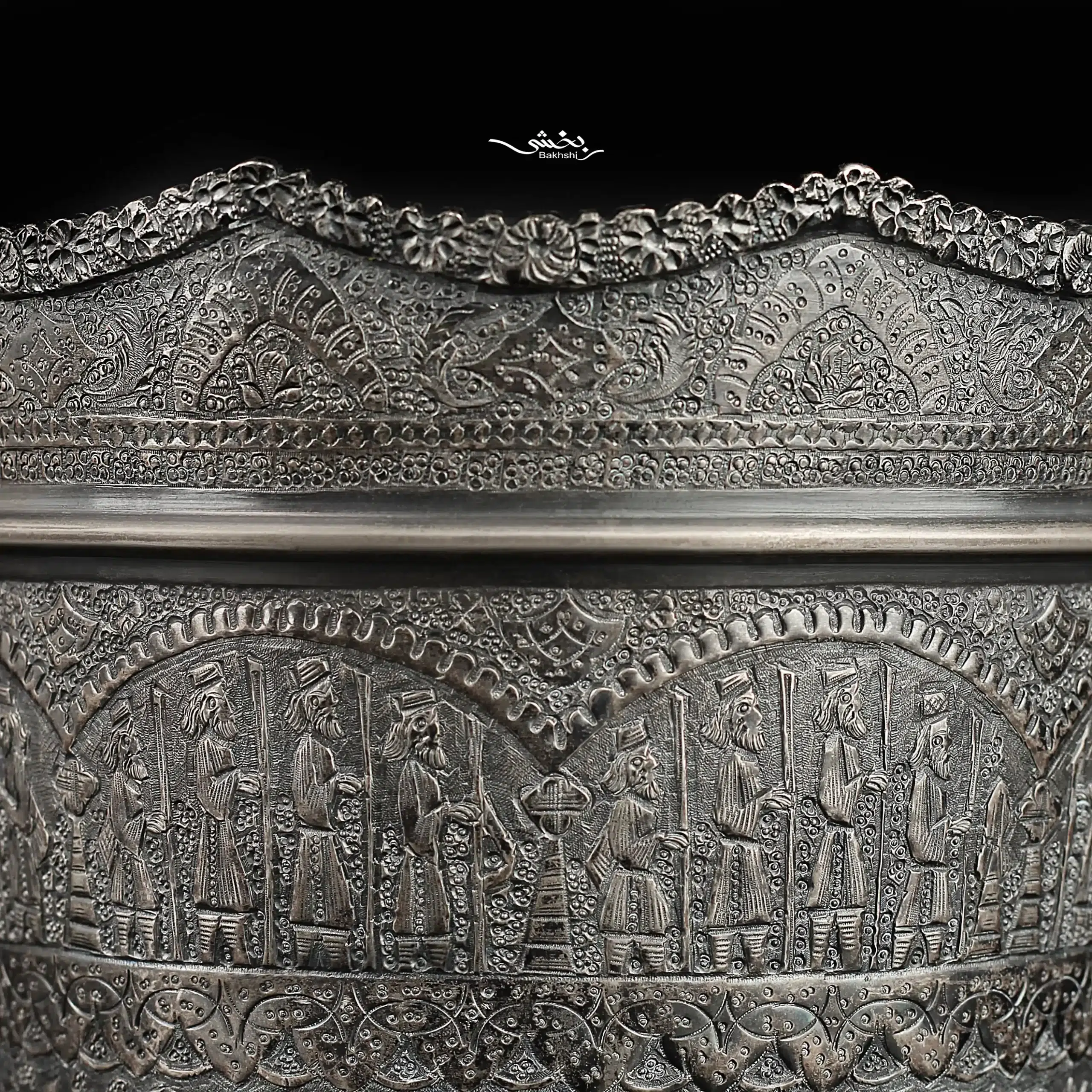 سطل نقره دسته دار قلم تخت جمشید با قطر 12 سانتیمتر و ارتفاع 19 سانتیمتر با احتساب دسته و وزن 314.1 گرم نقره با عیار 84 درصد موجود در شعب نقره بخشی.