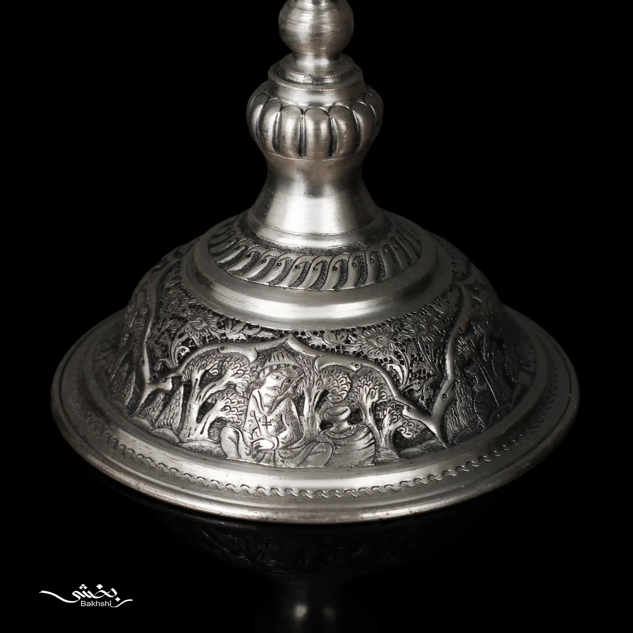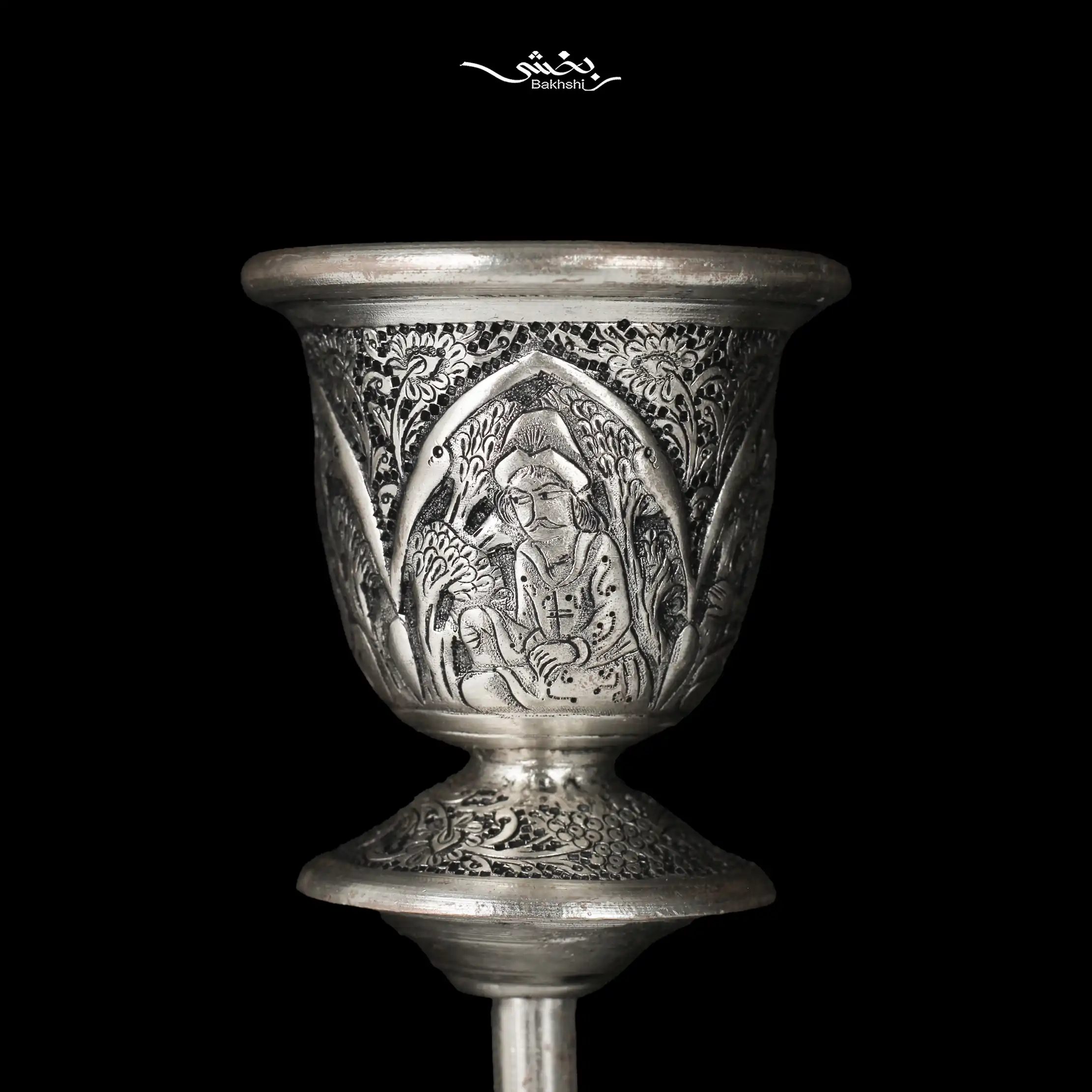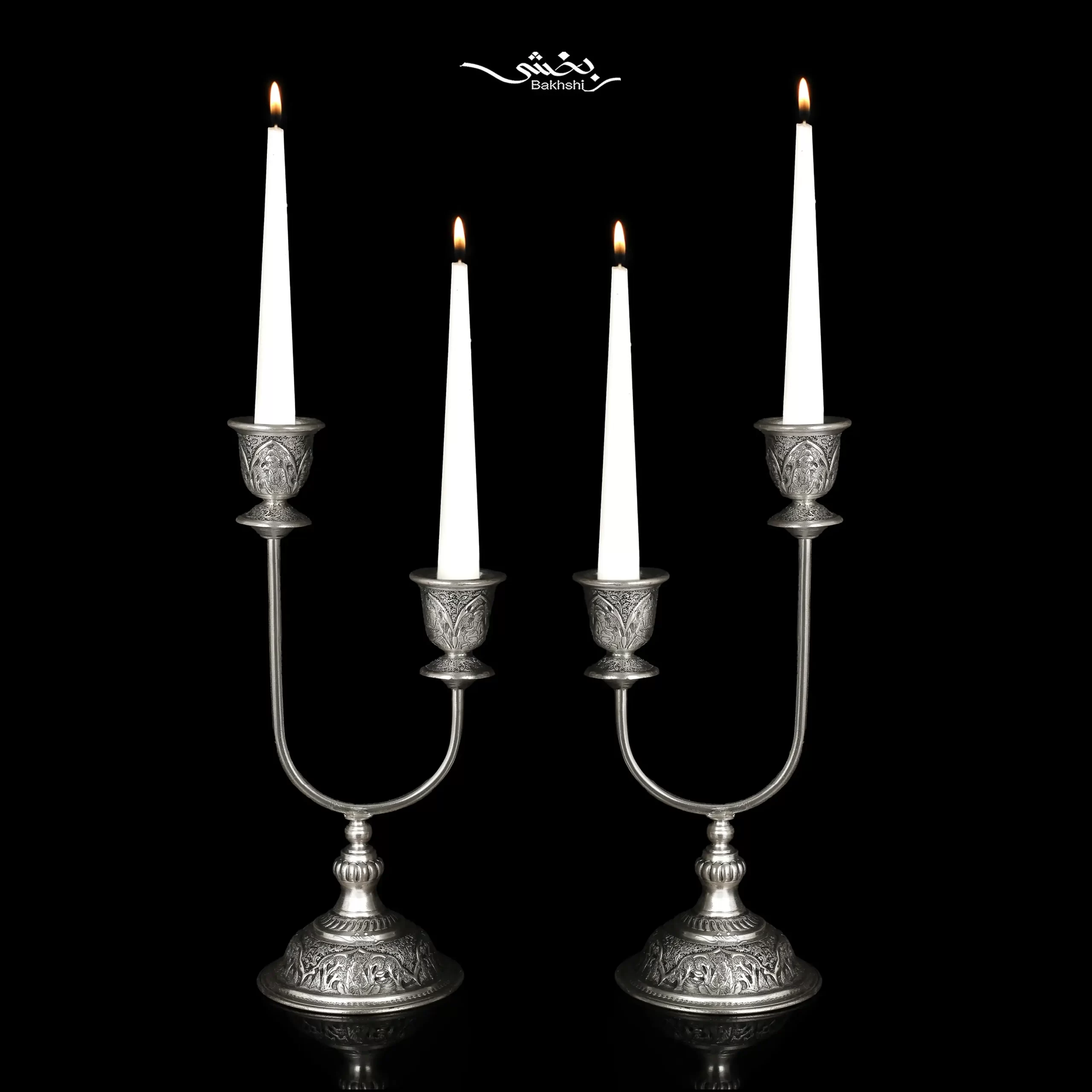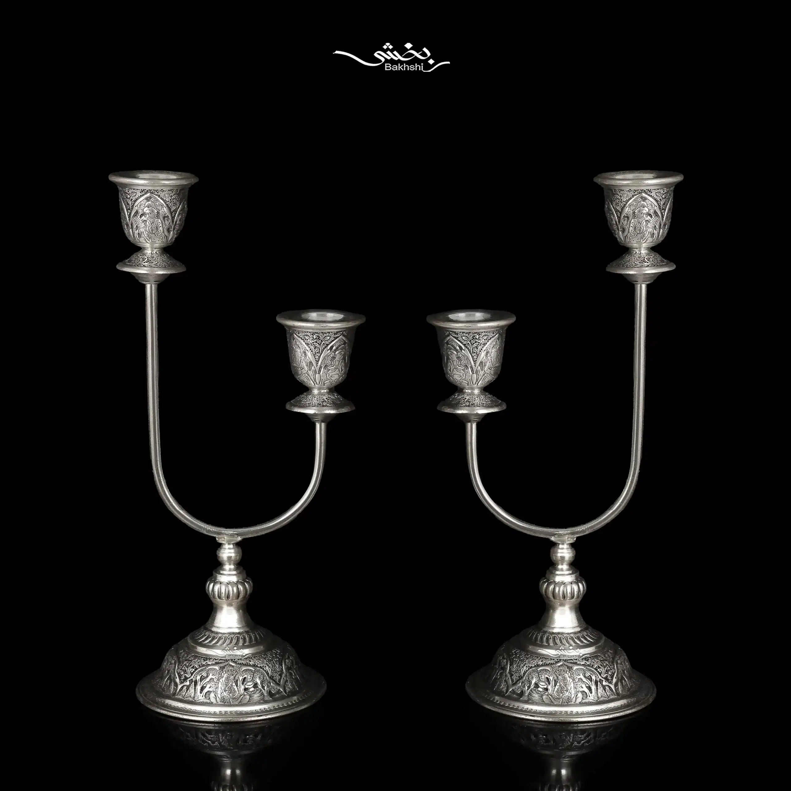 شمعدان نقره دوشاخه قلم مینیاتور اعلا ساخته شده از 951.5 گرم نقره با عیار 90 درصد و ارتفاع 31 سانتیمتر موجود در شعب حضوری و سایت نقره بخشی.