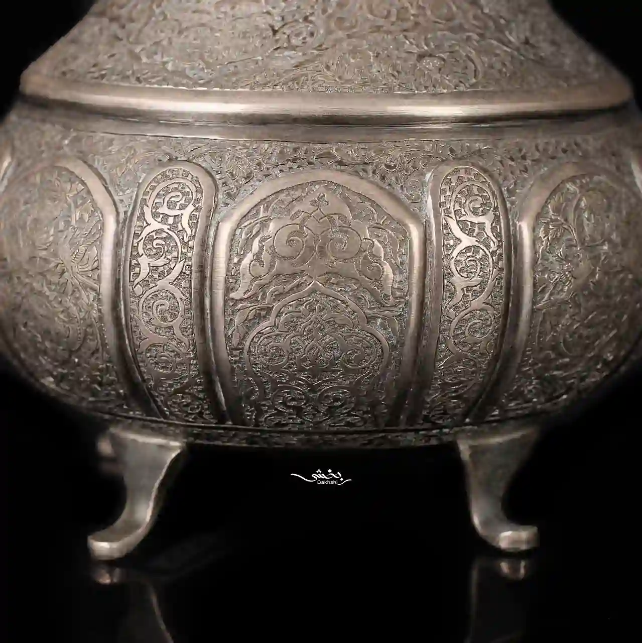 بدنه آن با طرح گل و مرغ قلمزنی شده و پرداخت براق آن جلوهای زیبا و اصیل به محصول داده است.