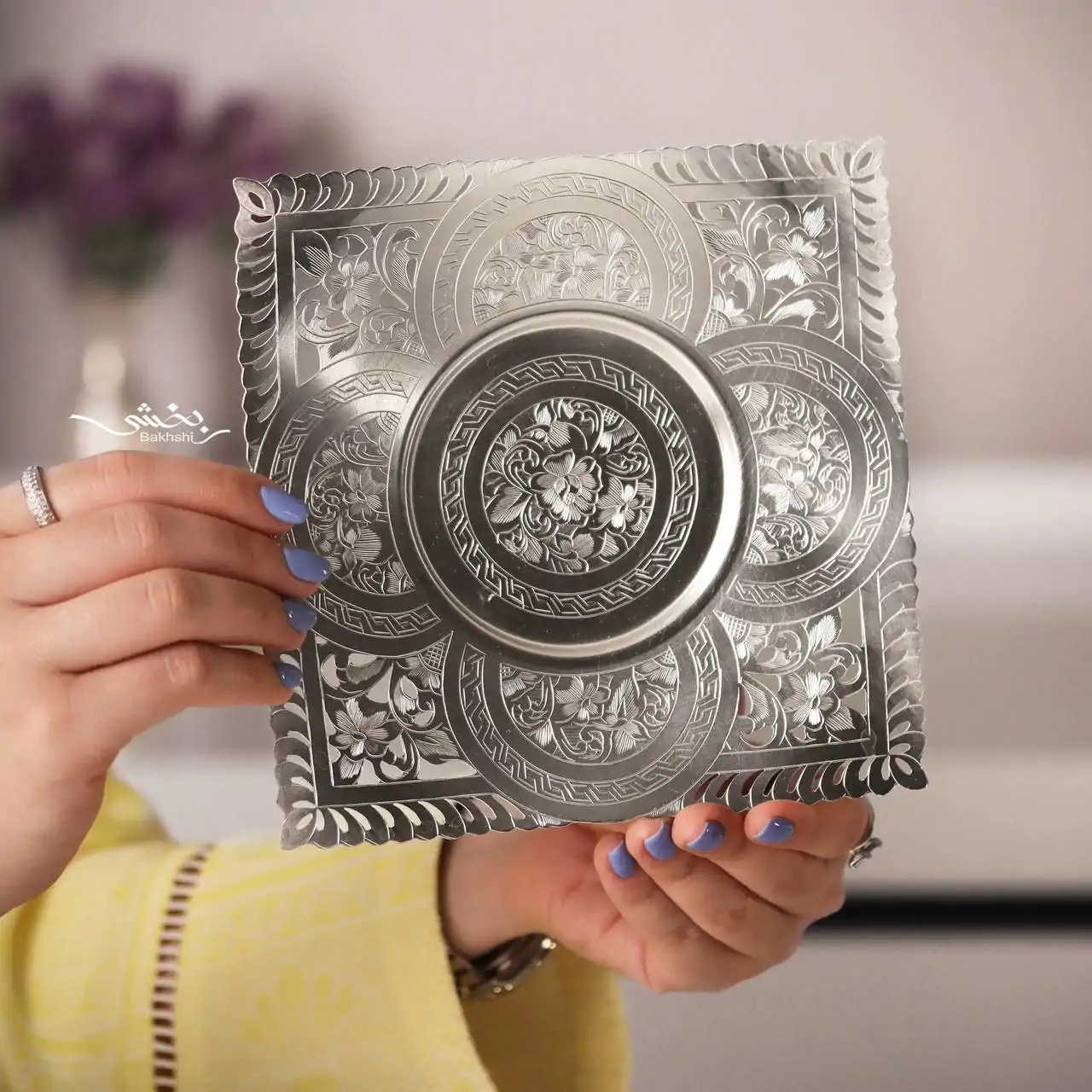 شیرینی خوری نقره مربع قلم تبریز با ابعاد 16 در 16 و ارتفاع 3 سانتیمتر در سه وزن 176 و 193.7 و 179.5 گرم نقره با عیار 84 موجود در نقره بخشی.