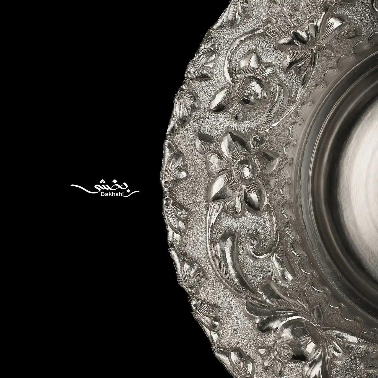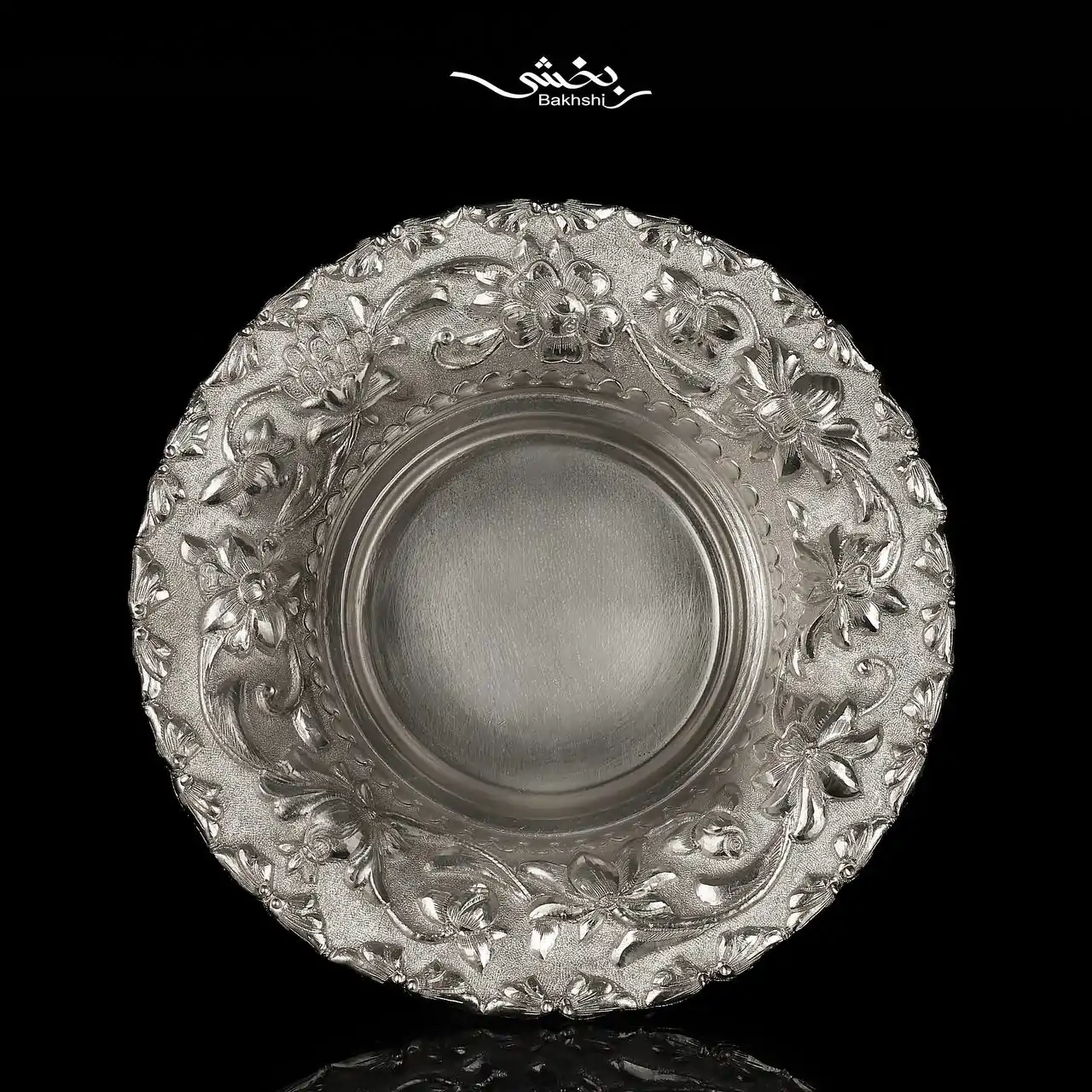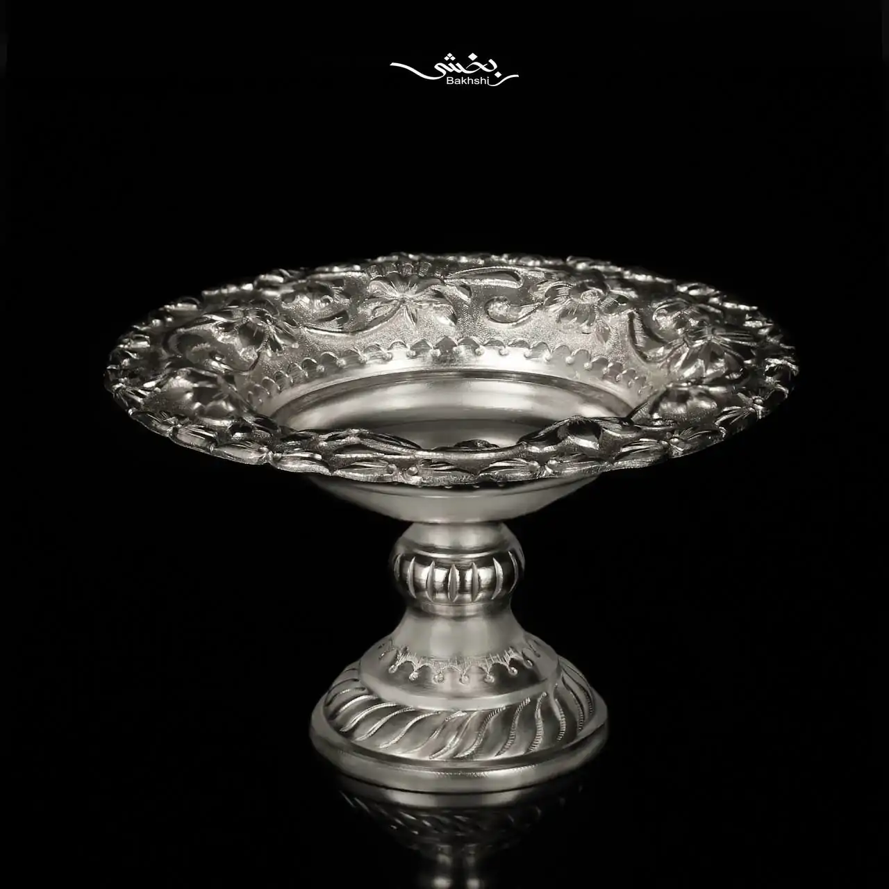 شیرینی خوری نقره پایه دار گل برجسته ساخته شده از 270 گرم نقره با عیار 84 درصد و قطر 15 و ارتفاع 8 سانتیمتر موجود در فروشگاه حضوری و سایت نقره بخشی