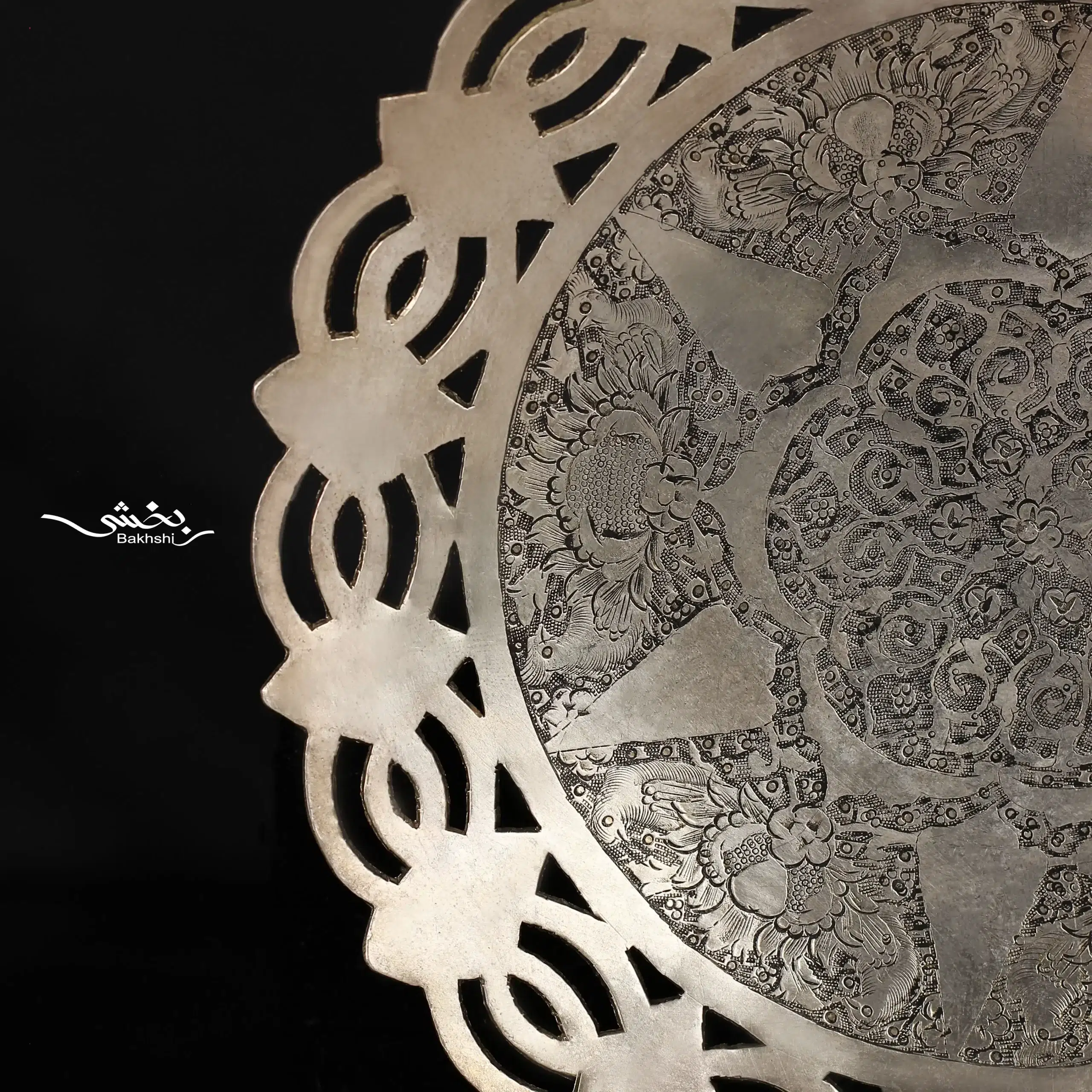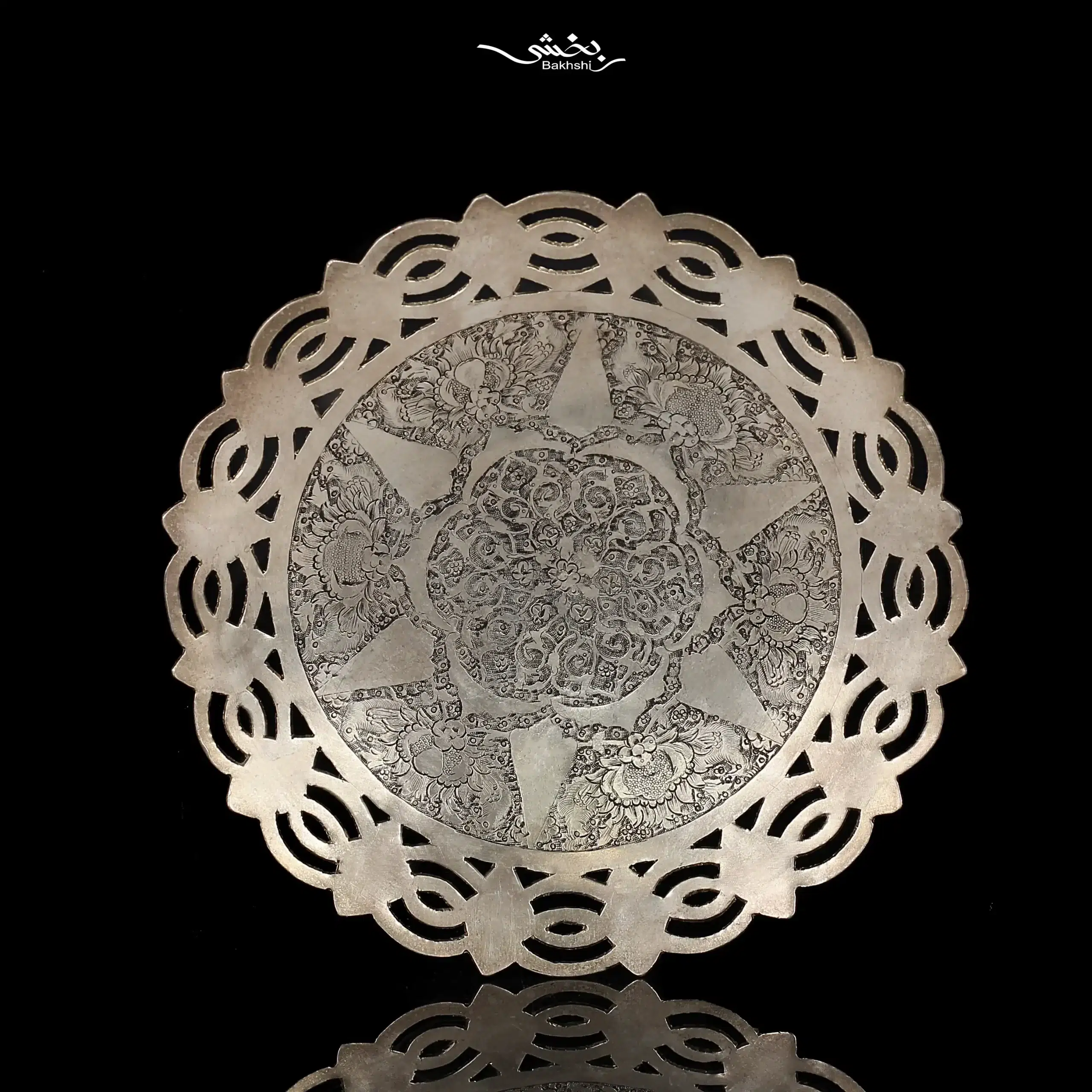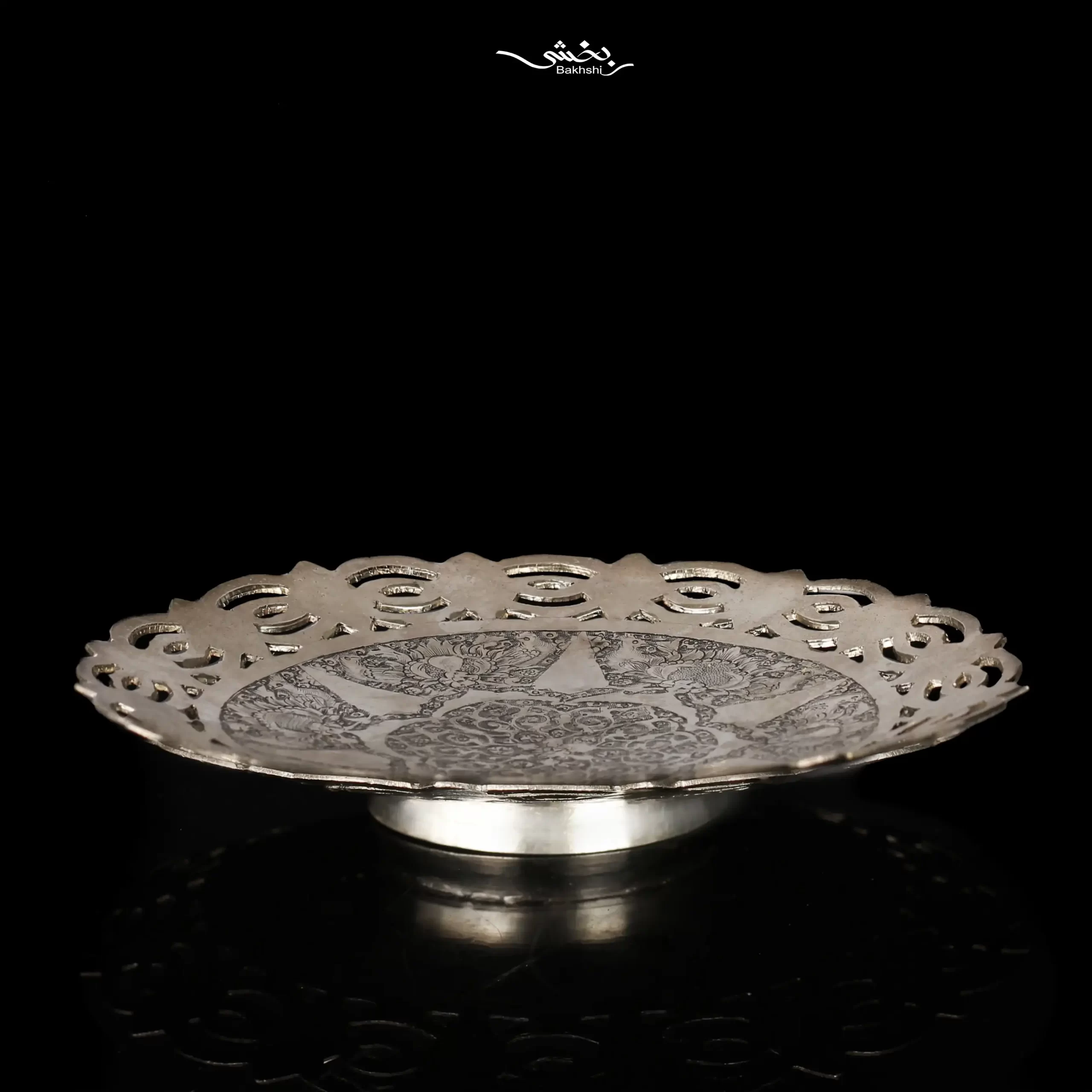 شیرینی خوری نقره 6 عددی ترنج قدیمی با قطر 14.5 سانتیمتر و وزن 870.1 گرم نقره با عیار 84 درصد موجود در شعب حضوری و سایت نقره بخشی.