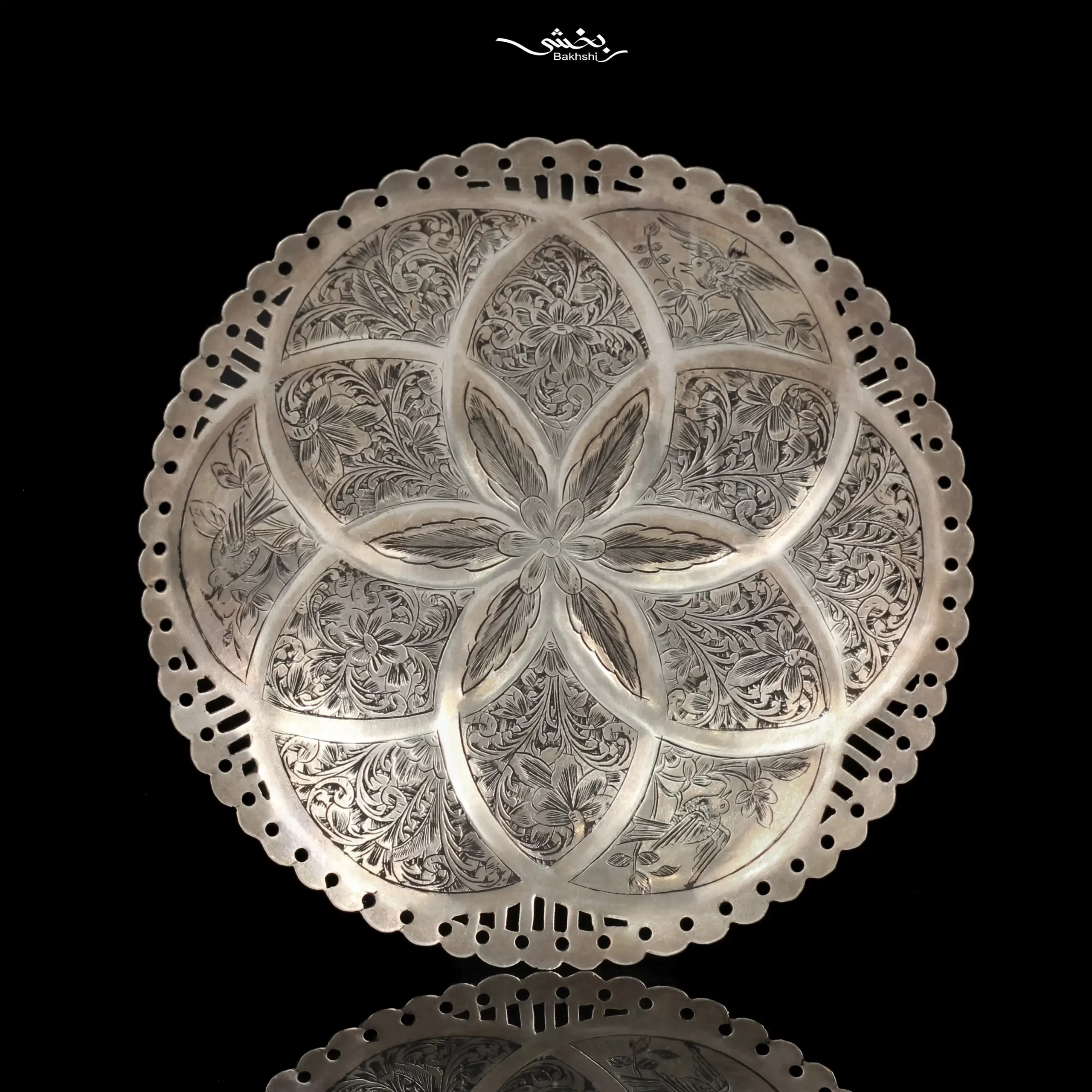 شیرینی خوری نقره 6 عددی قلم گل و مرغ با قطر 16 و ارتفاع 3.5 سانتیمتر و وزن 1015.5 گرم نقره با عیار 84 درصد موجود در شعب حضوری و سایت نقره بخشی.