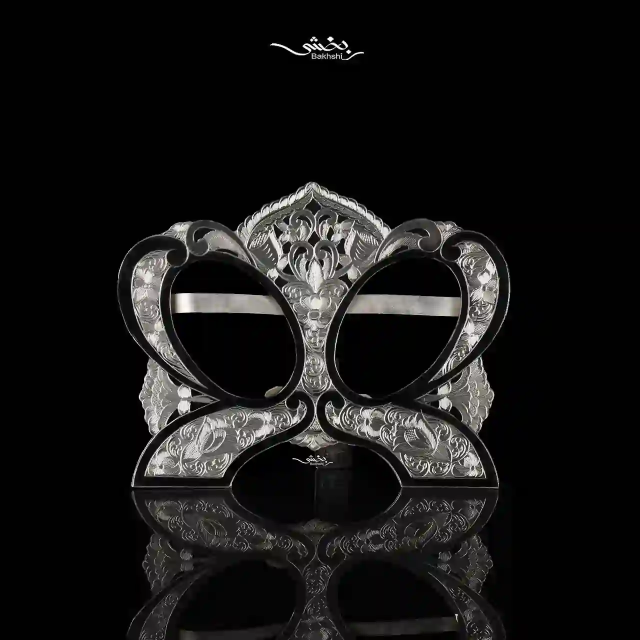 قاب عکس نقره بیضی دوقلو قلم تبریز کد 25 ساخته شده از 162 گرم نقره با عیار 84 درصد و ابعاد 18.5*15*3 سانتیمتر موجود در شعب حضوری و سایت نقره بخشی.