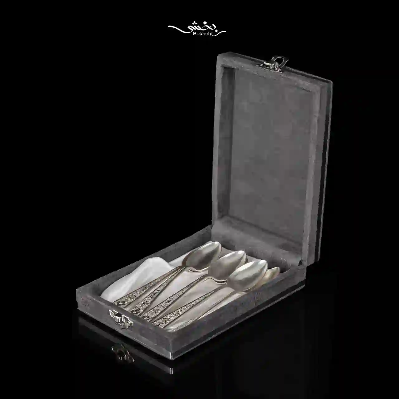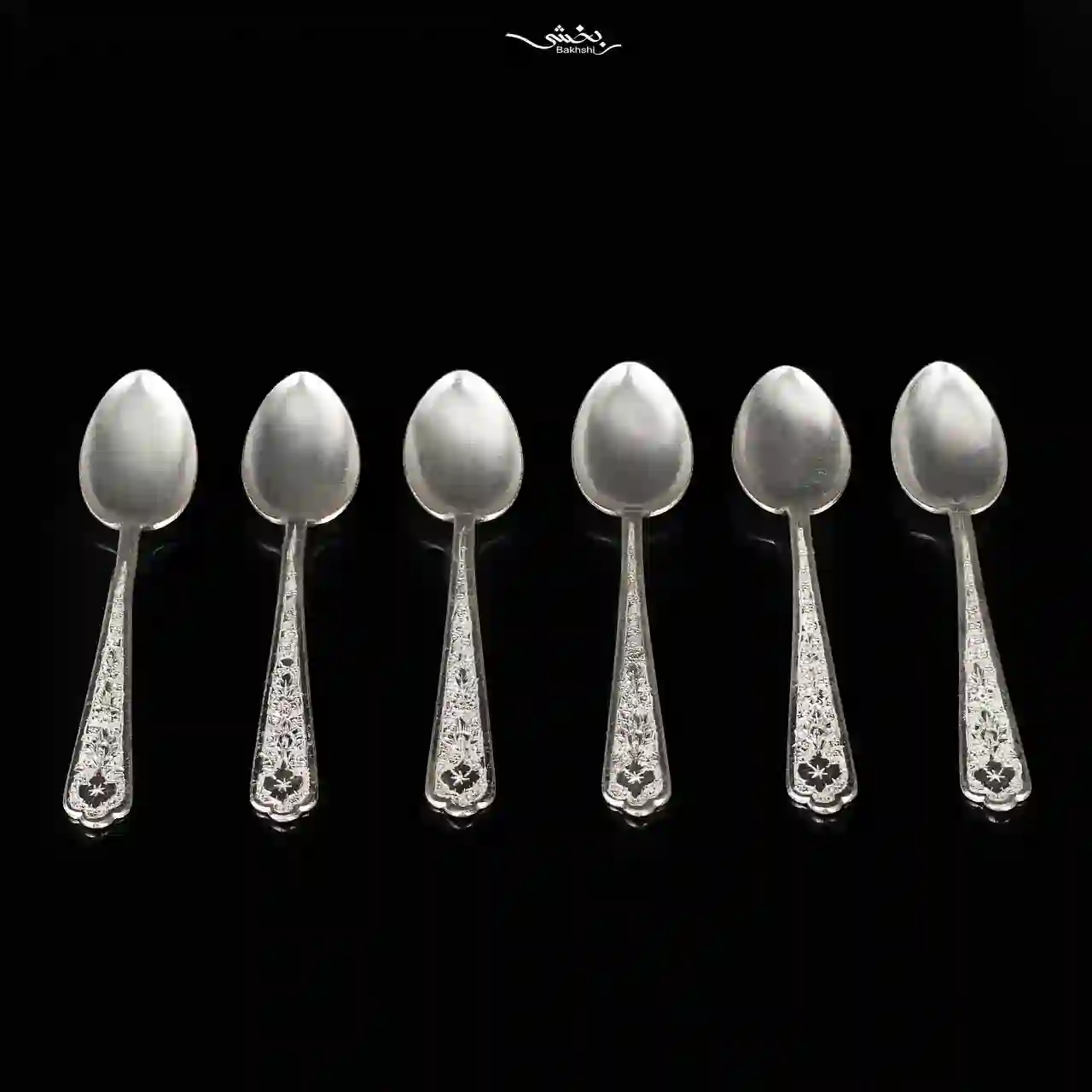 قاشق نقره شربت خوری قلم ترنج ساخته شده از 137 گرم نقره با عیار 84 درصد و تعداد 6 تایی با طول 14 سانتیمتر موجود در شعب حضوری و سایت نقره بخشی.