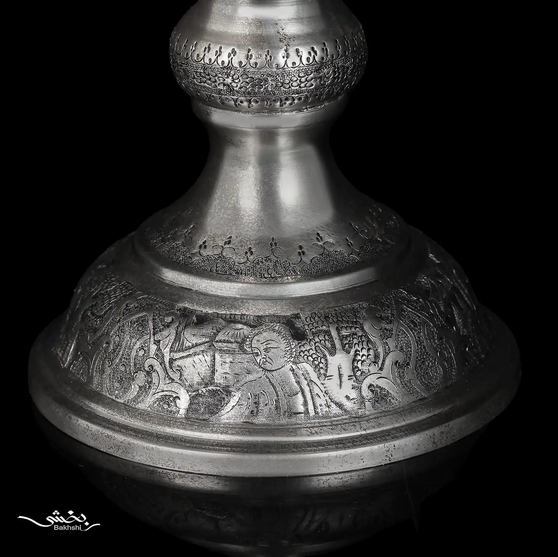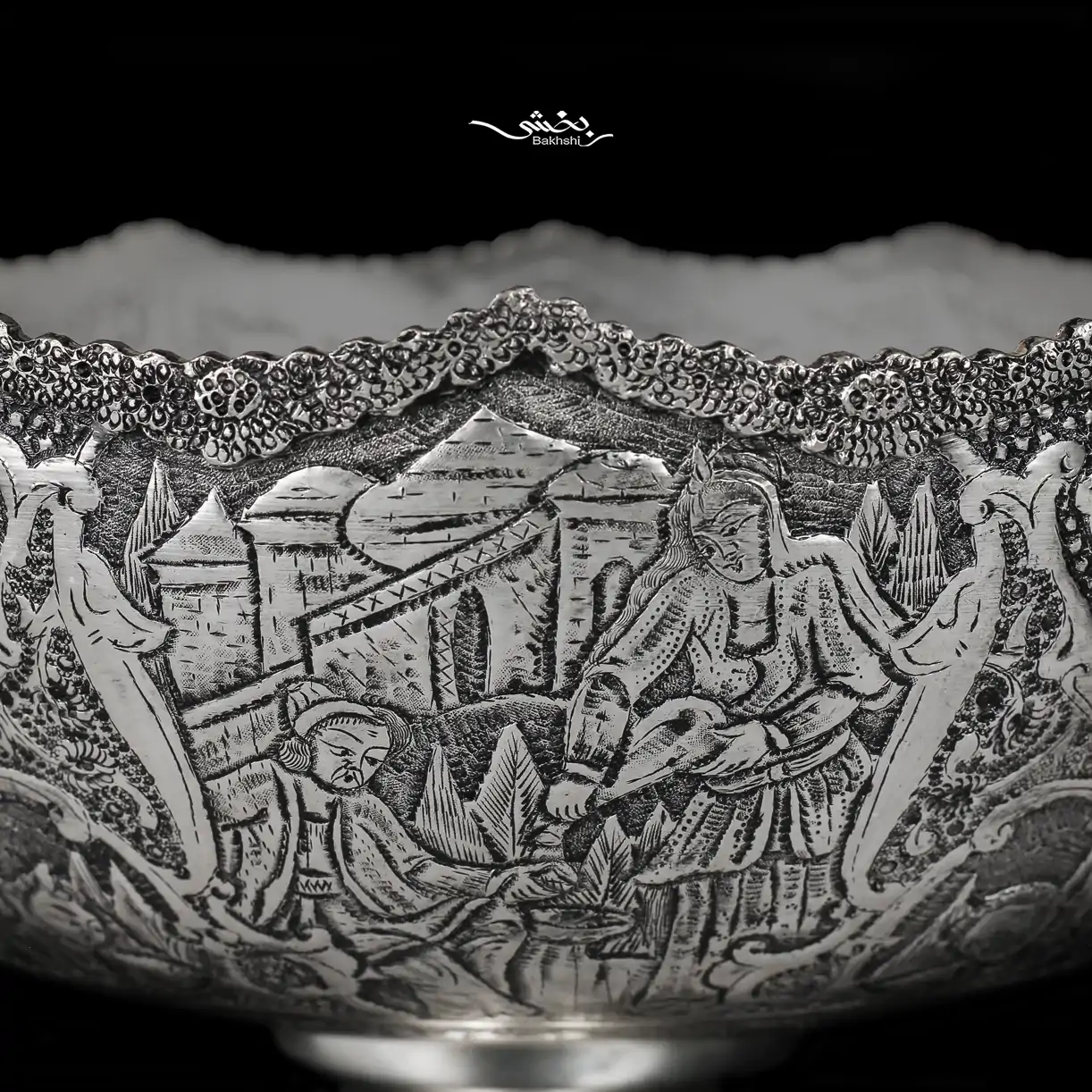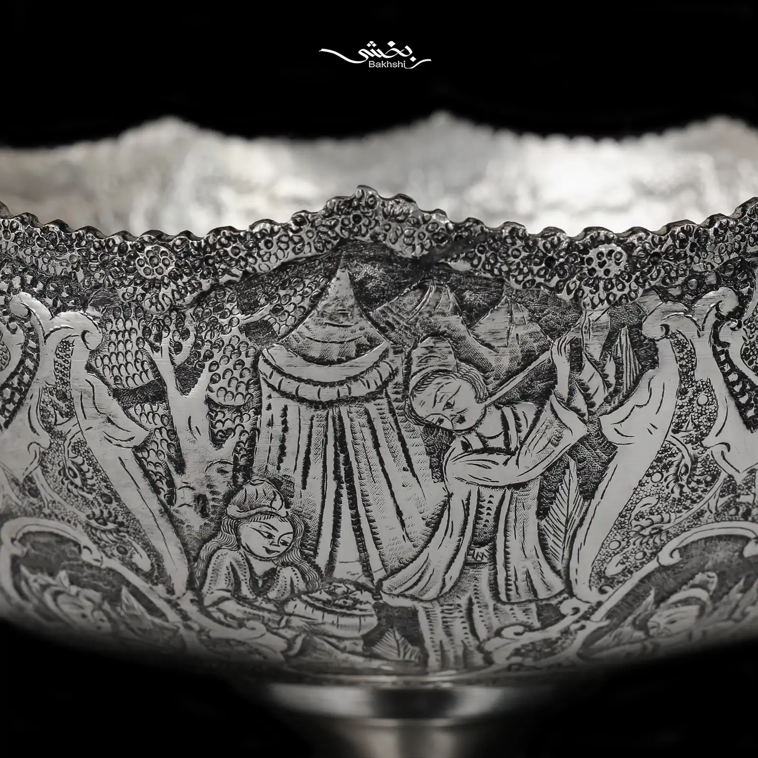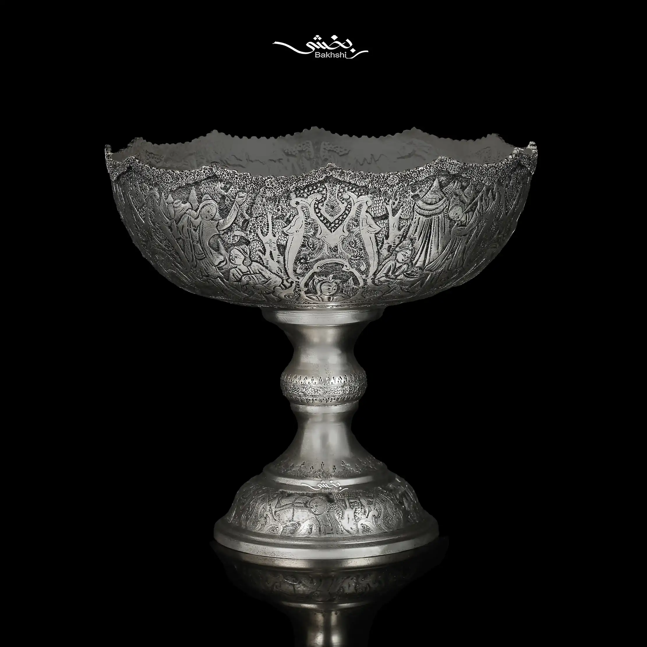 میوه خوری پایه دار نقره قلم مینیاتور ساخته شده از 1075 گرم نقره با عیار 84 و قطر 26 و ارتفاع 24 سانتیمتر موجود در شعب حضوری و سایت نقره بخشی.