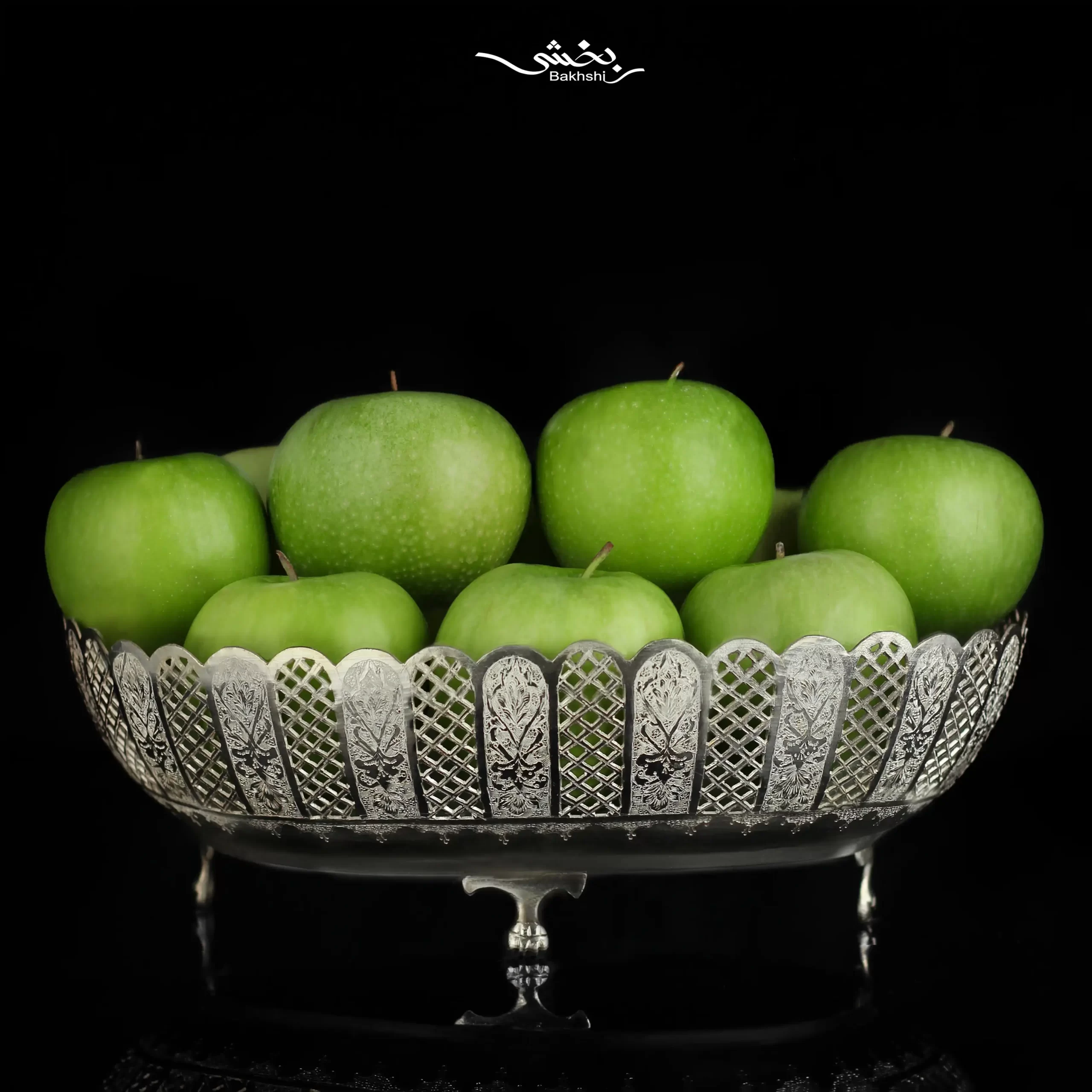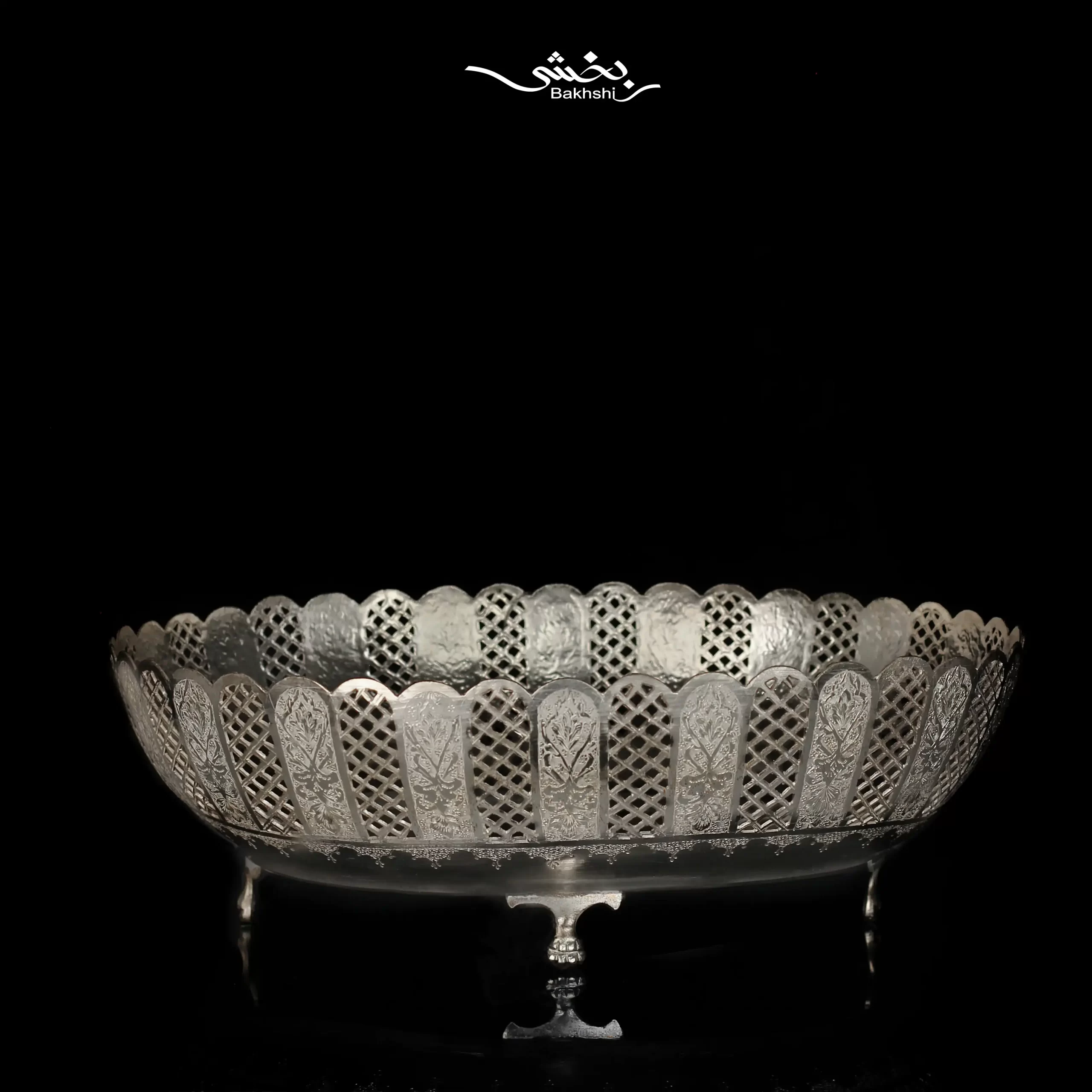 کاسه بیضی نقره قلم ترنج با ابعاد 29 در 21 و ارتفاع 9 سانتیمتر و وزن 659 گرم نقره با عیار 84 درصد موجود در شعب حضوری و سایت نقره بخشی.