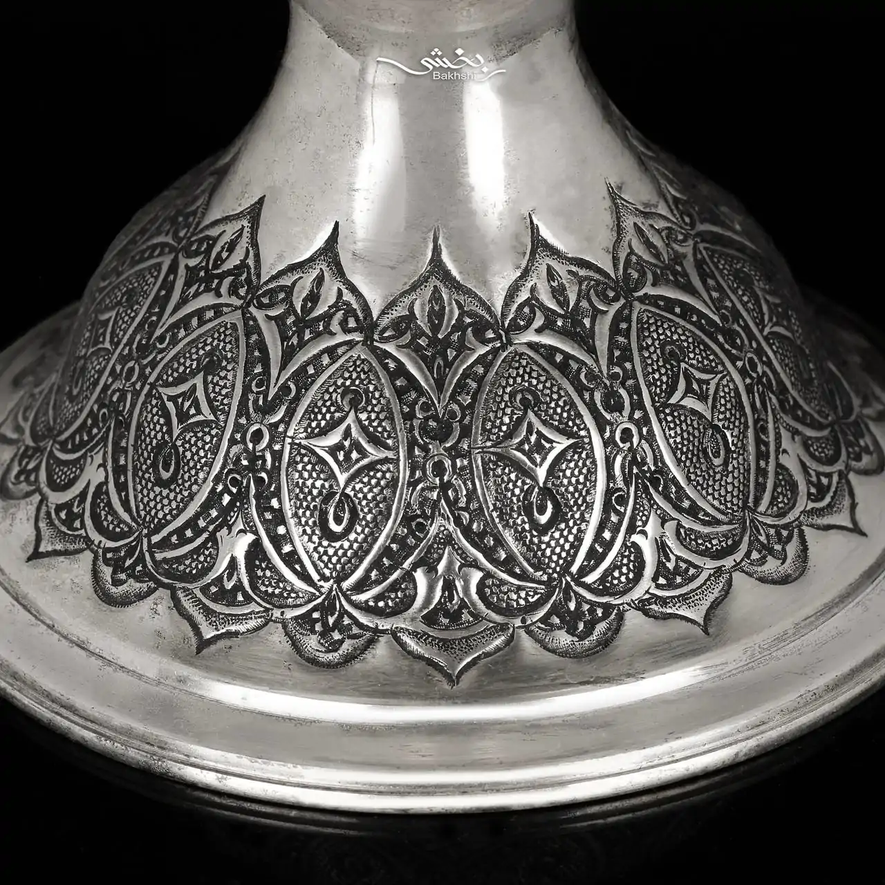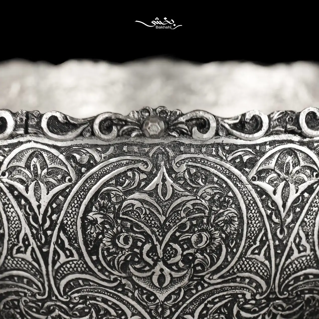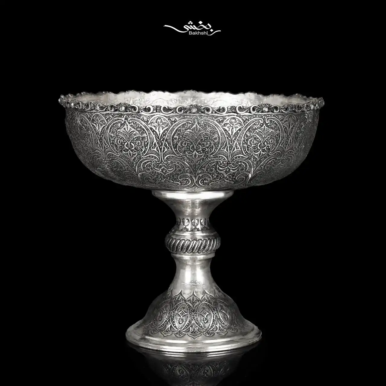 کاسه نقره پایه دار ریزقلم گل و مرغ اعلا ساخته شده از 1856 گرم نقره با عیار 90 درصد و قطر 30 و ارتفاع 28 سانتیمتر موجود در شعب حضوری و سایت نقره بخشی.