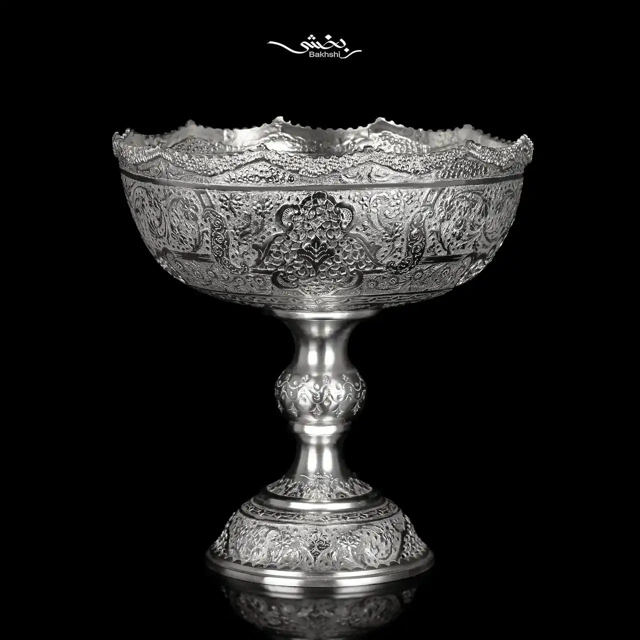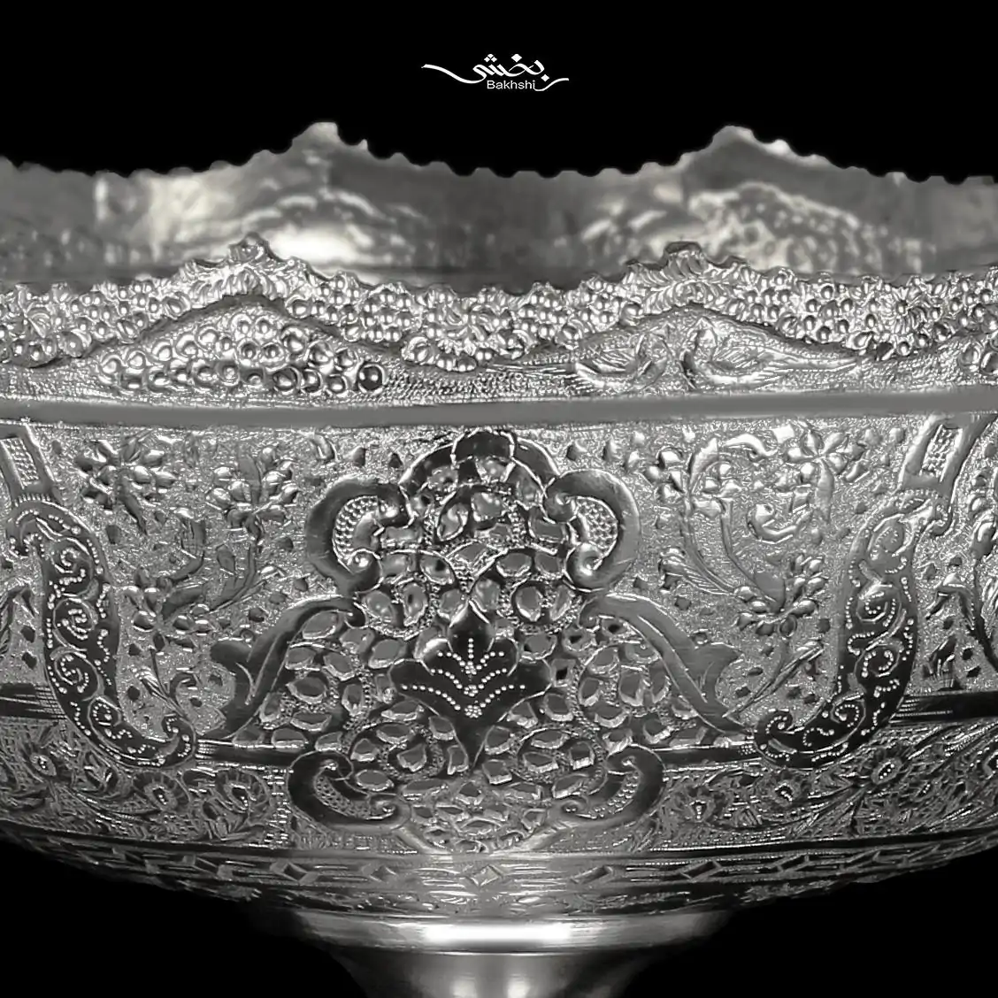 کاسه نقره گرد پایه دار قلم گل و مرغ هنر دست و ساخته شده از 729 گرم نقره عیار 84 درصد و قطر 21 و ارتفاع 22 سانتیمتر موجود در شعب نقره بخشی.