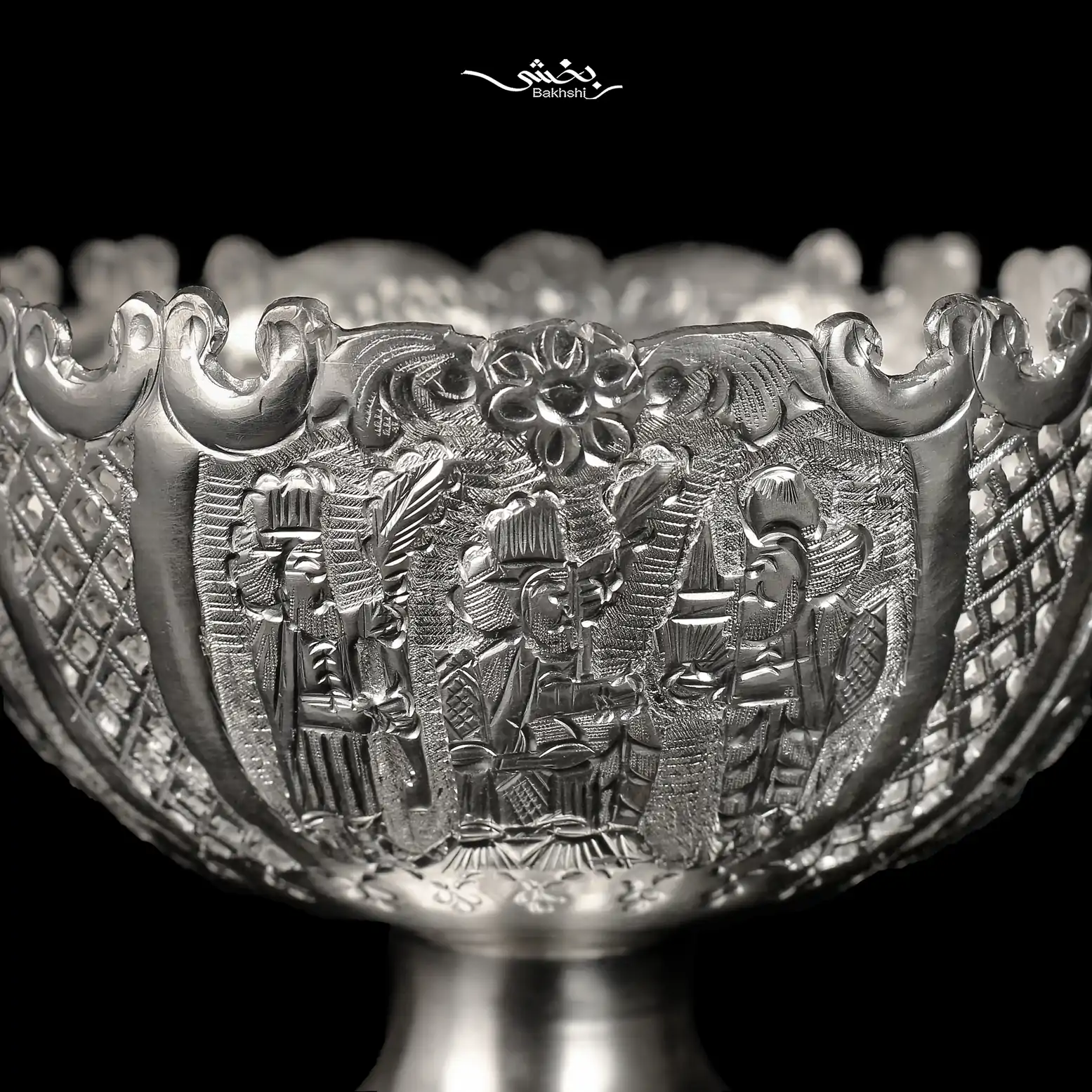 کاسه پایه دار نقره قلم تخت جمشید با قطر 10/5 و ارتفاع 8/5 سانتیمتر و ساخته شده از 182 گرم نقره با عیار 84 درصد موجود در نقره بخشی.