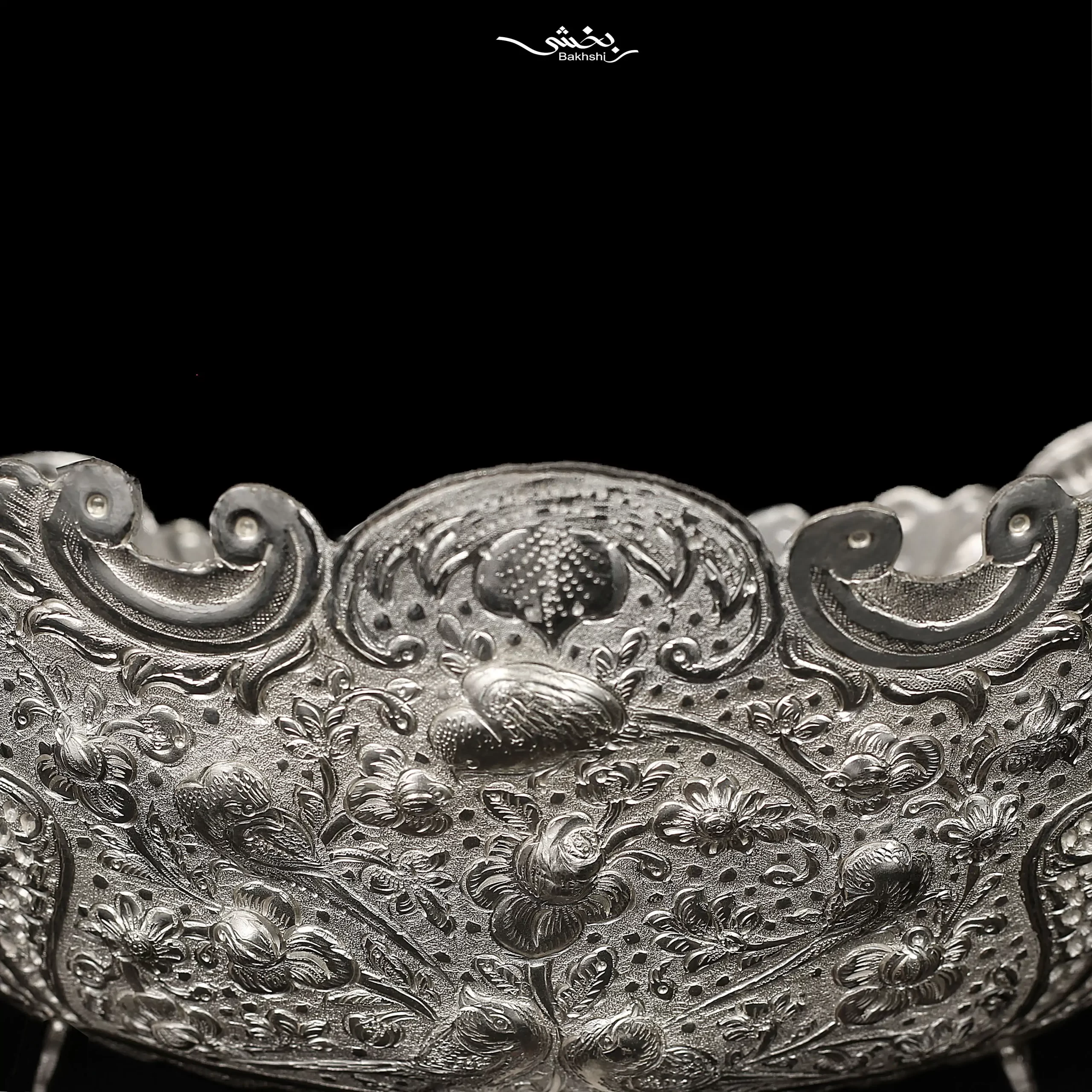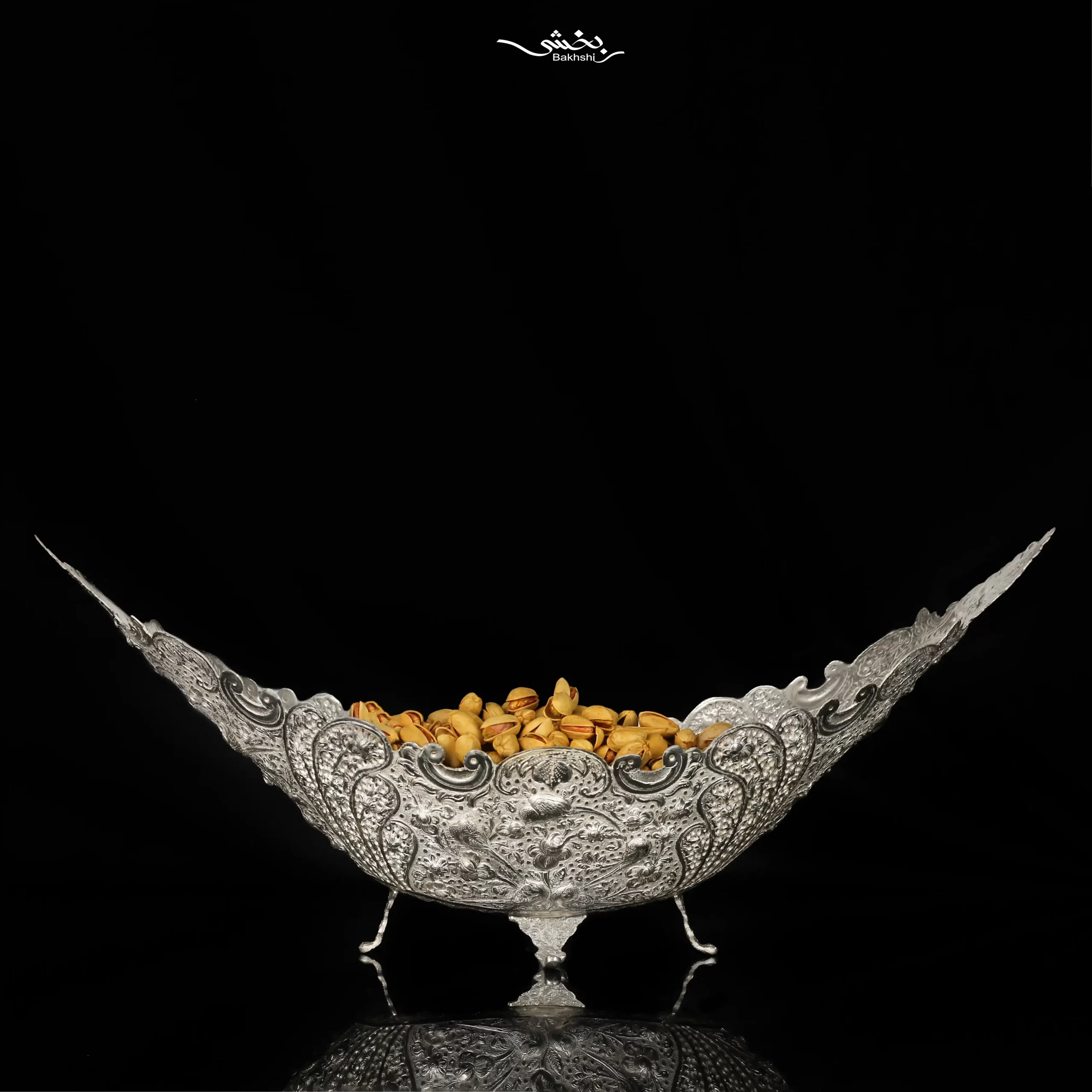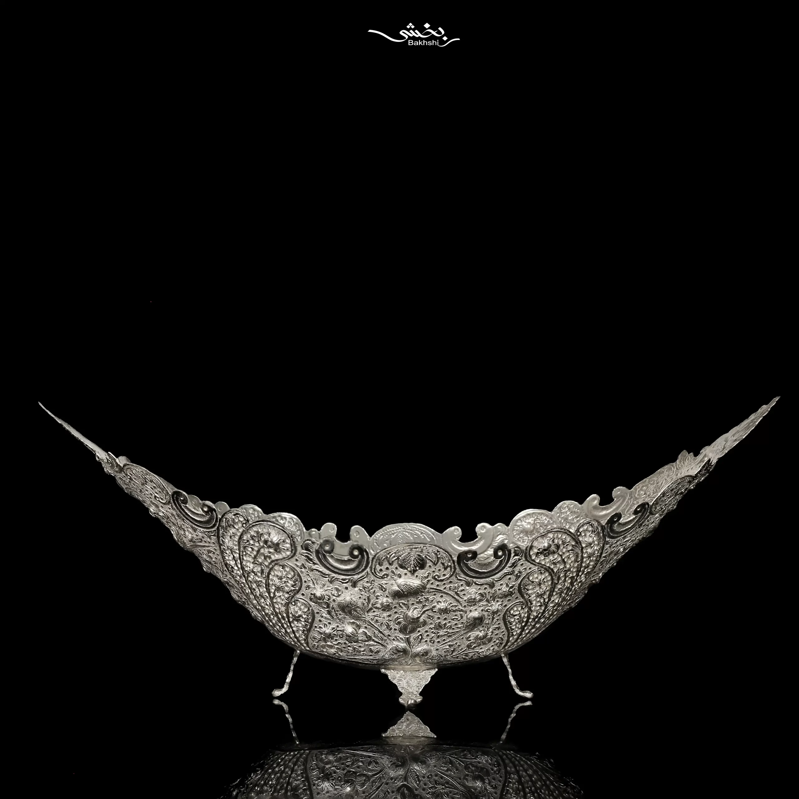 کشکول قایقی نقره قلم گل و مرغ ساخته شده از 1089.2گرم نقره با عیار 84 درصد و ابعاد 53 در 23 و ارتفاع 21 سانتیمتر موجود در شعب حضوری و سایت نقره بخشی.