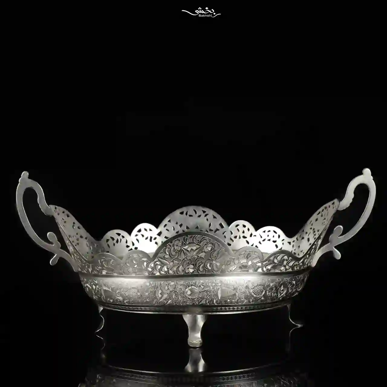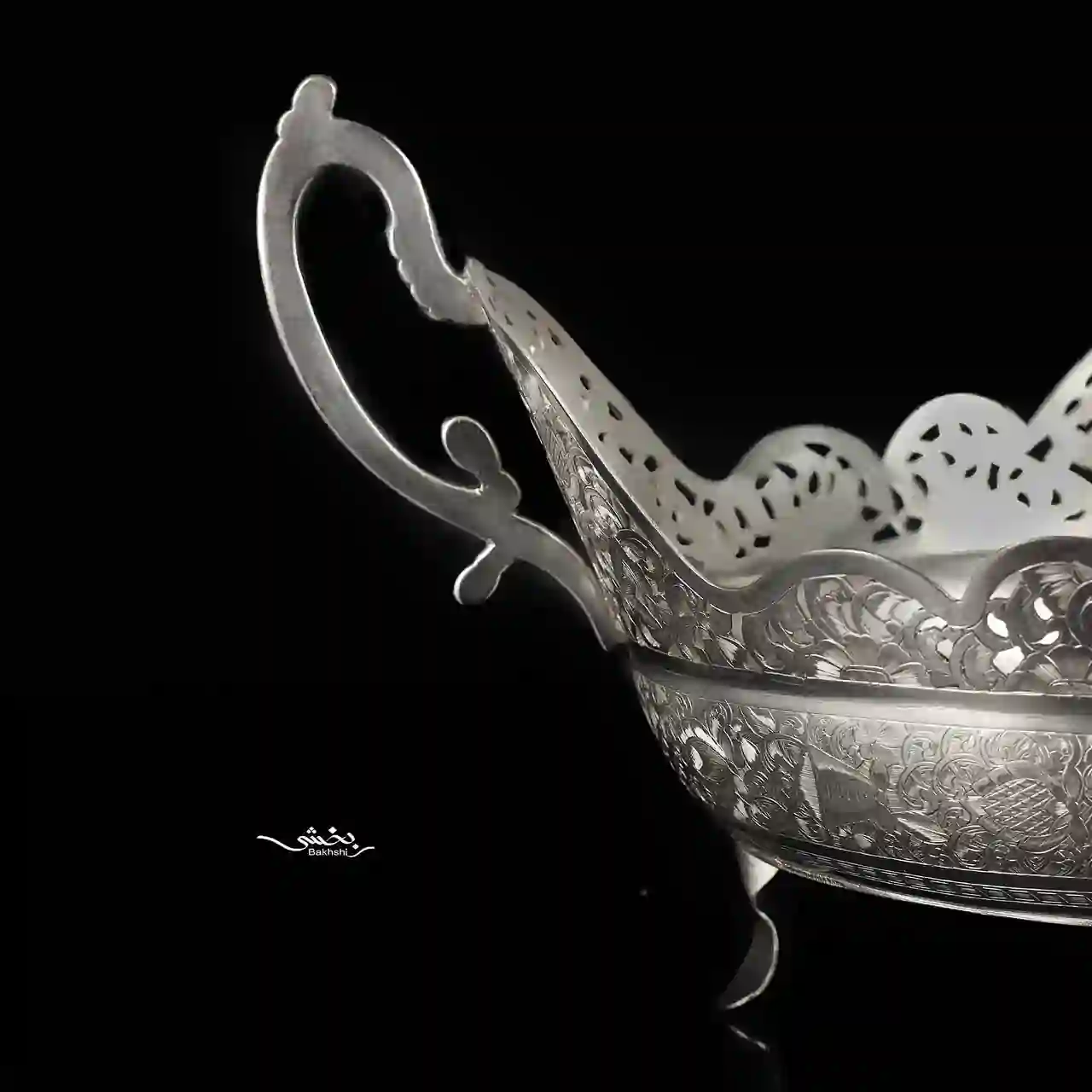 کشکول نقره دسته دار قلم تبریز ساخته شده از 990 گرم نقره با عیار 84 درصد و طول 21 و عرض 40 و ارتفاع 13 سانتیمتر موجود در شعب حضوری و سایت نقره بخشی.