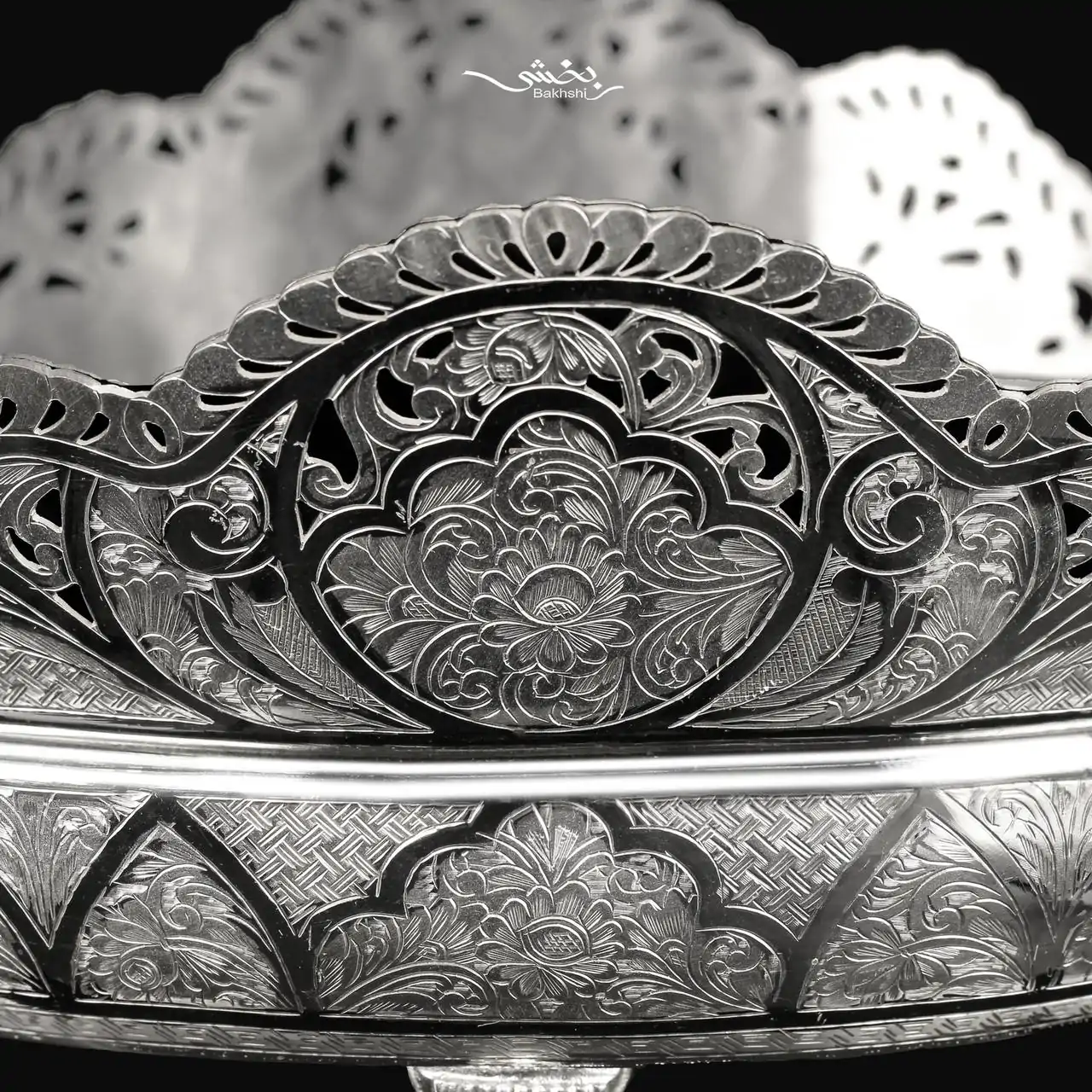 کشکول نقره ژاردنین قلم تبریز یک اثر فاخر و ساخته شده از 867.8 گرم نقره با عیار 84 و ابعاد 45 در 2 سانتیمتر با احتساب دسته و ارتفاع انتهای دسته 17 سانتیمتر موجود در شعب نقره بخشی