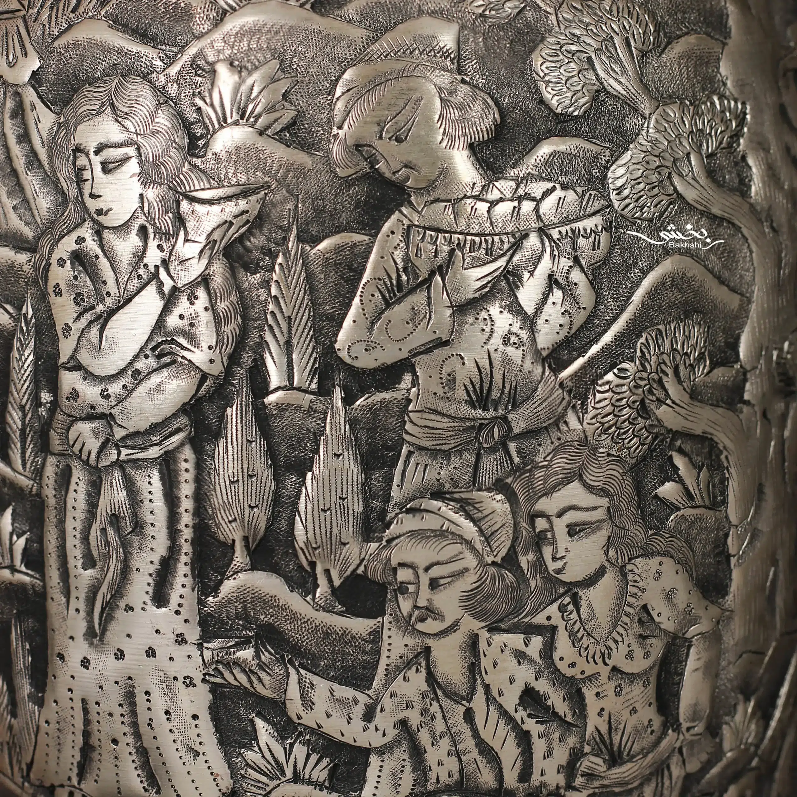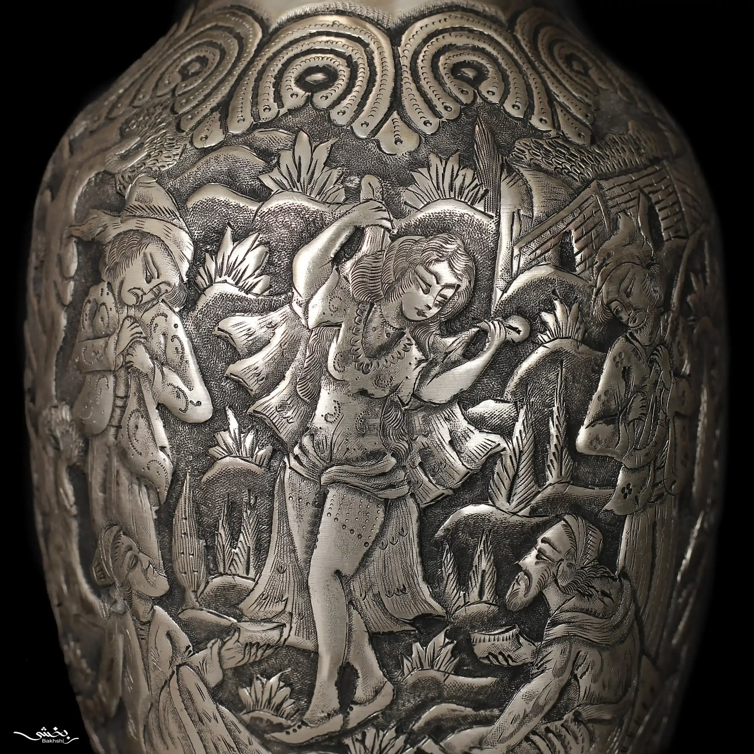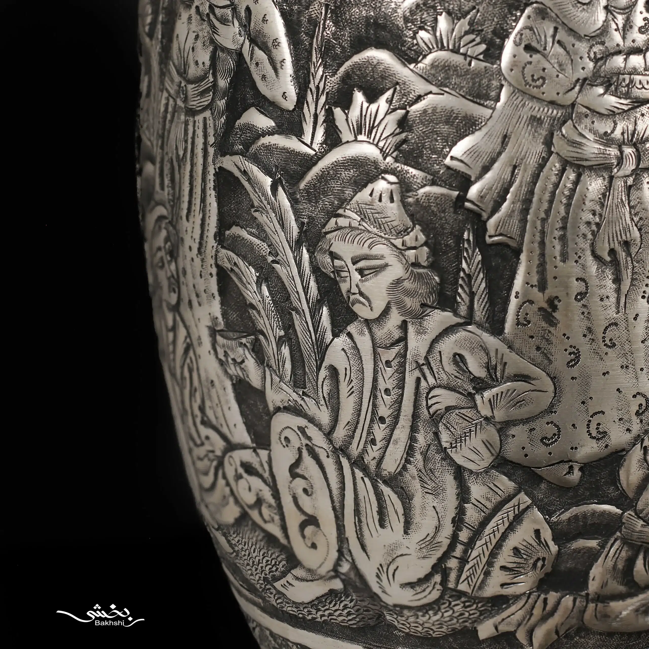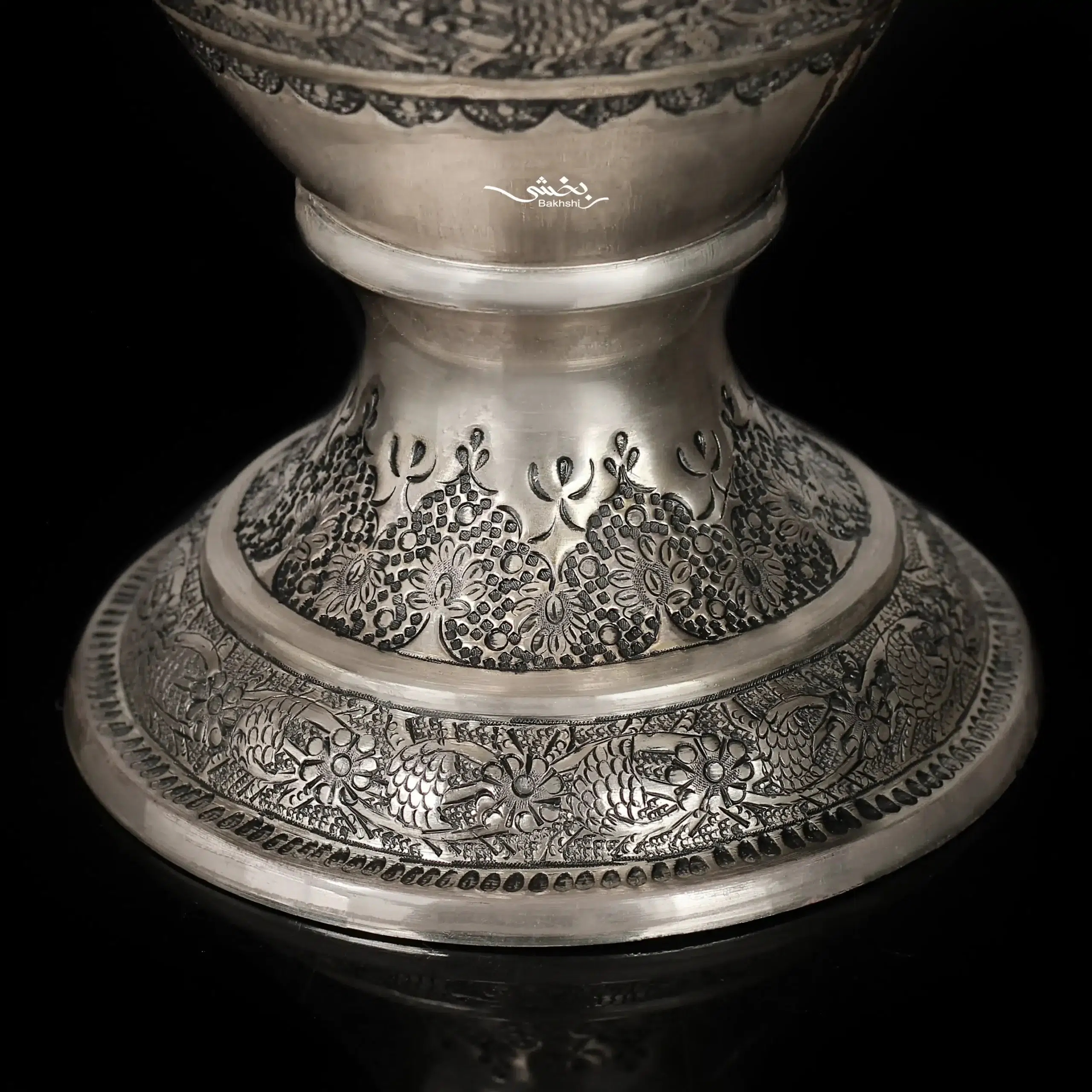 گلدان شکم دار نقره قلم مینیاتور ساخته شده از 628.8 گرم نقره با عیار 84 درصد و ارتفاع 29 و عرض 11 سانتیمتر موجود در شعب نقره بخشی.