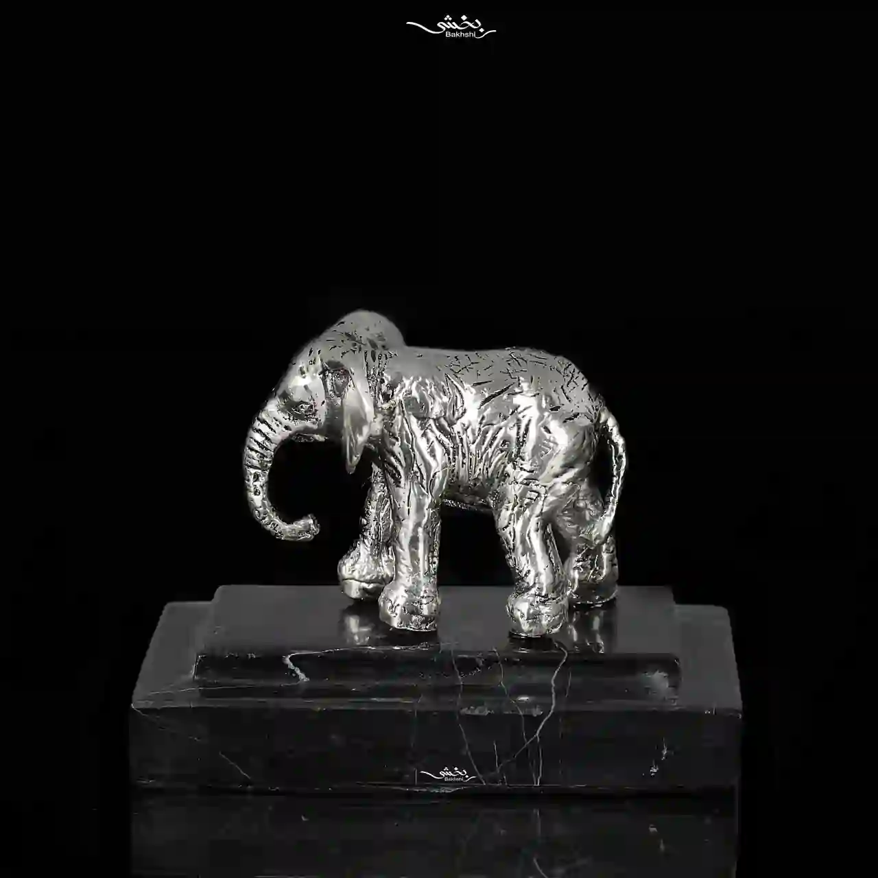 مجسمه دکوری نقره طرح فیل ساخته شده از 102 گرم نقره با عیار 92.5 و ارتفاع 9.5 سانتیمتر موجود در شعب حضوری و سایت نقره بخشی.